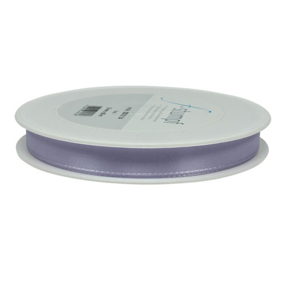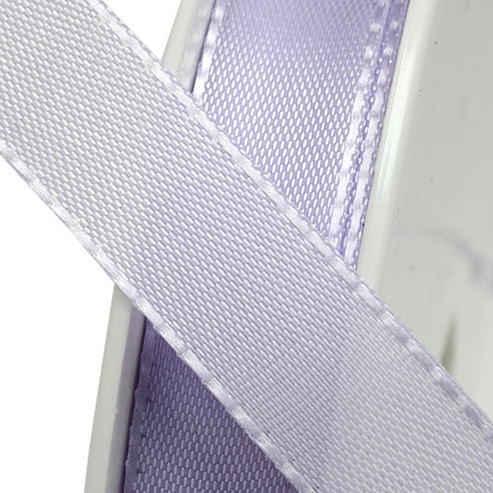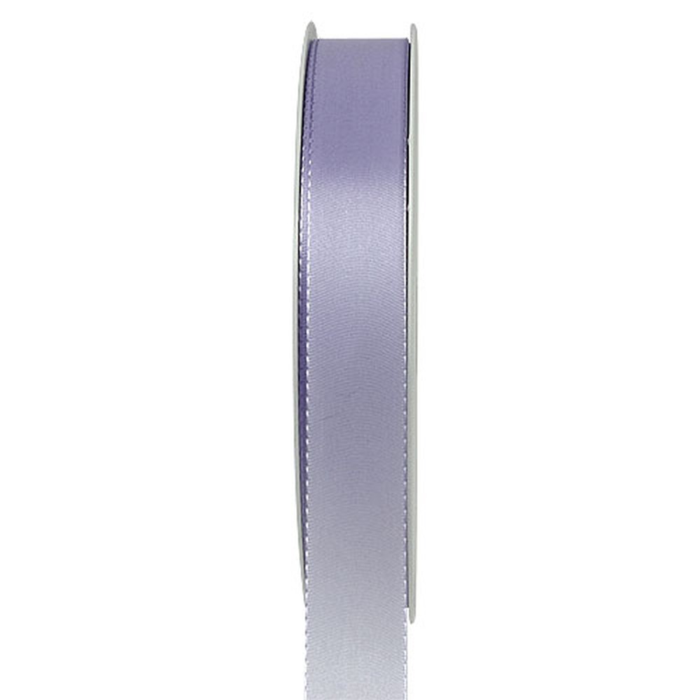 Gave- og dekorasjonsbåndet i lys syrin er viklet på en plastrulle og er rundt 50 meter langt og rundt 15 millimeter bredt.