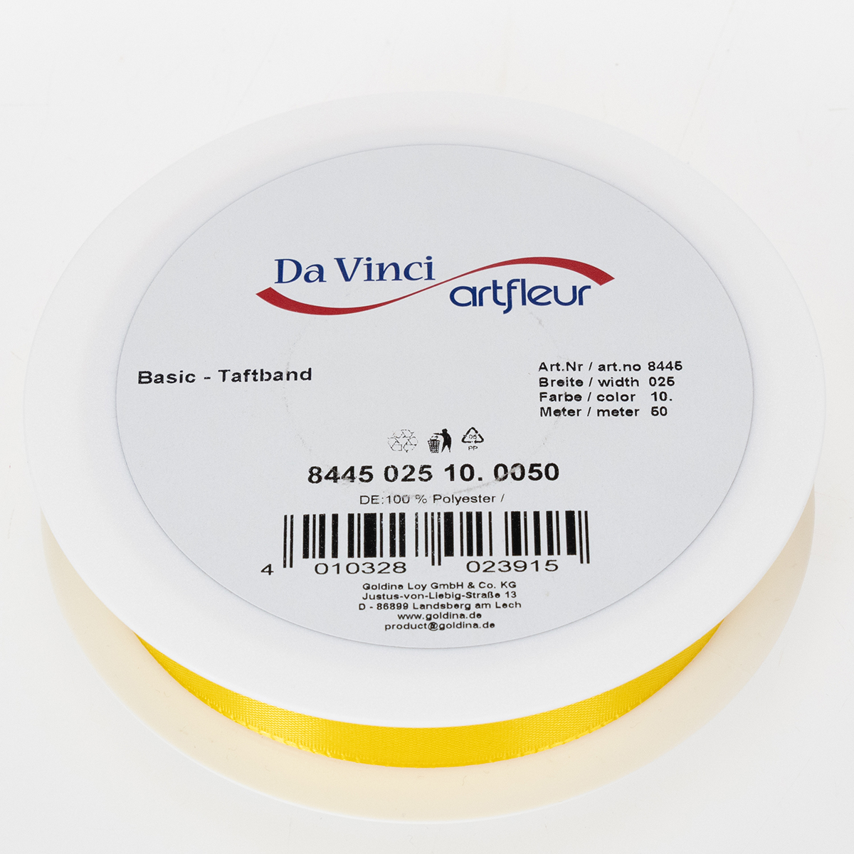 Gave- og dekorasjonsbåndet i gult er ca 25 millimeter bredt og ca 50 meter langt.