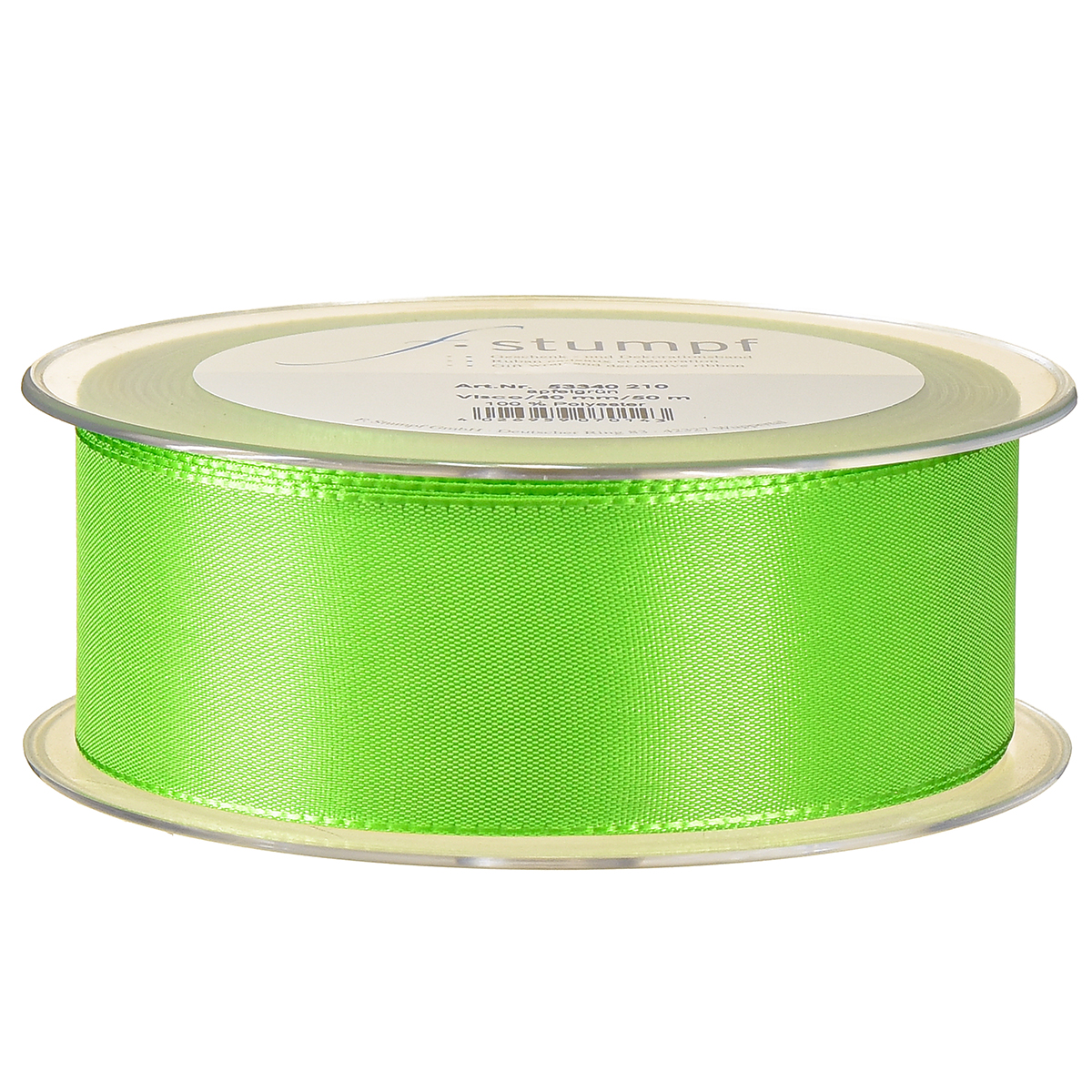 Gave- eller dekorasjonsbåndet i lysegrønt er cirka 40 millimeter bredt og cirka 50 meter langt. Den var laget av 100% polyester.