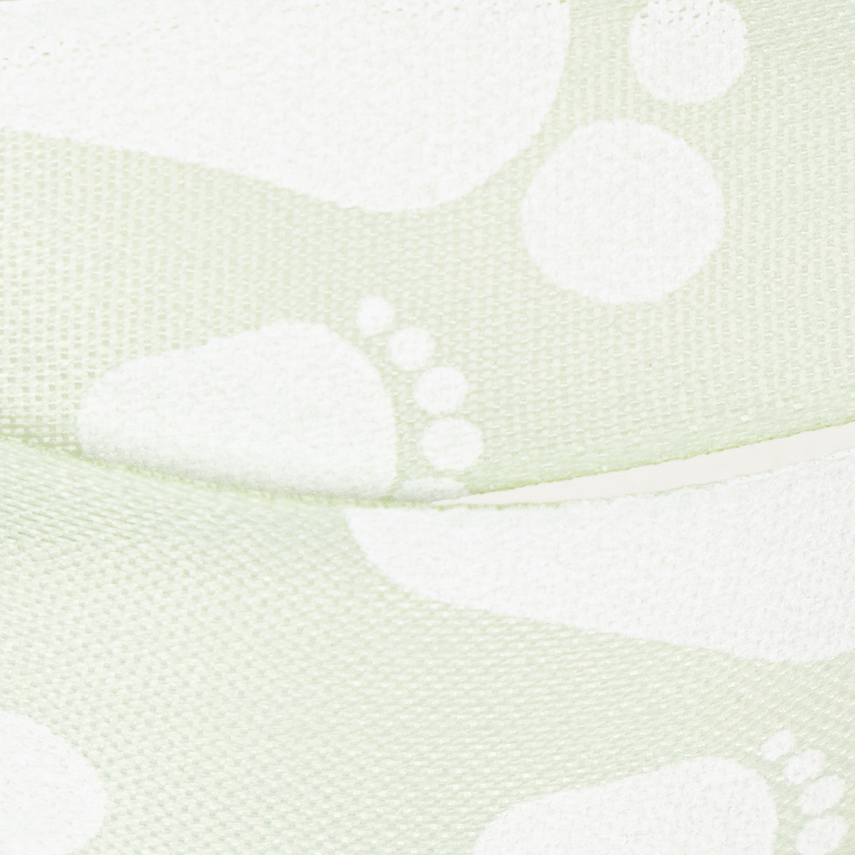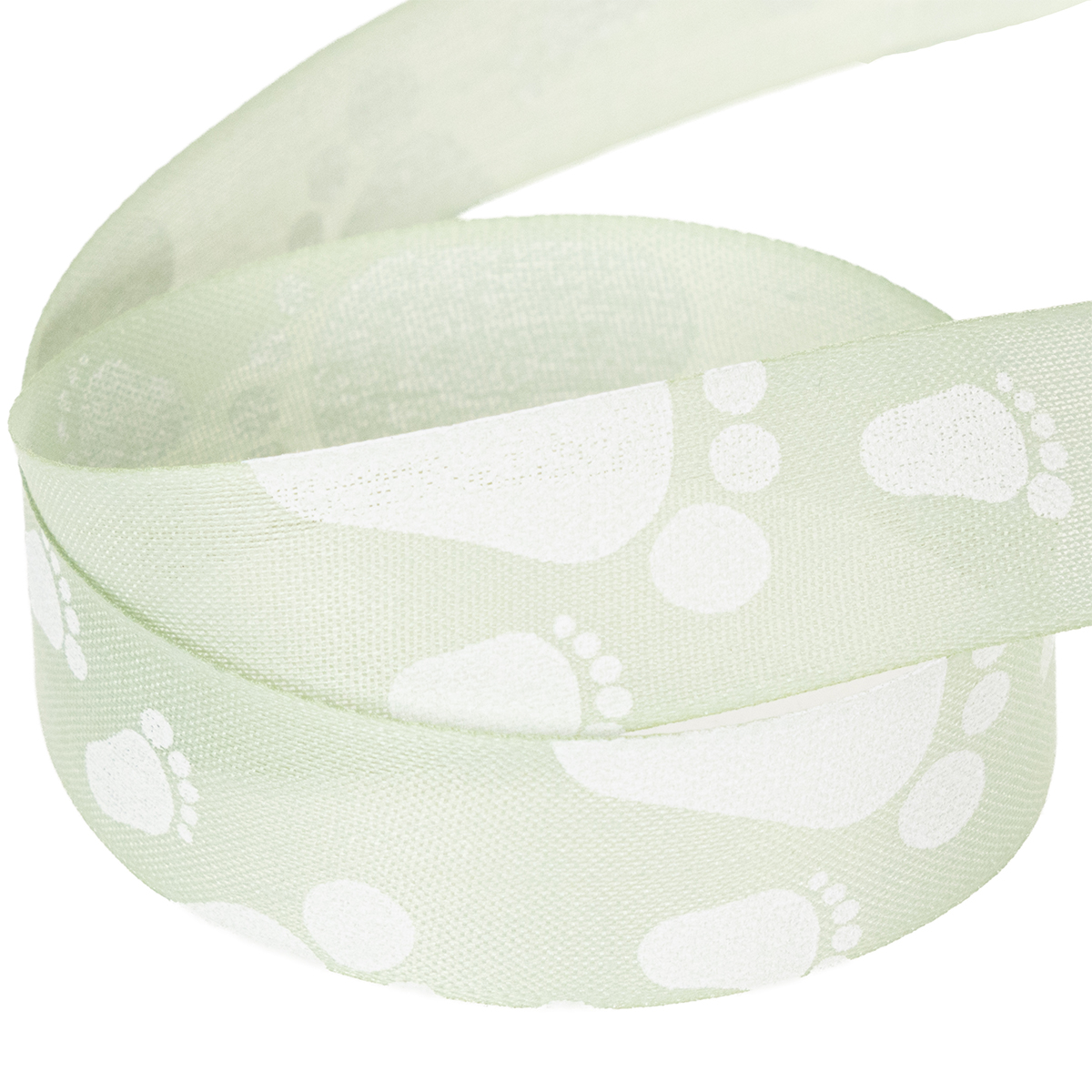 Den lyse, pastellgrønne bakgrunnen på stoffbåndet er dekorert med mindre og større fotavtrykk. I hvitt danner babyføttene en vakker kontrast til fargen på det dekorative båndet og fanger dyktig temaet for den glade begivenheten.
