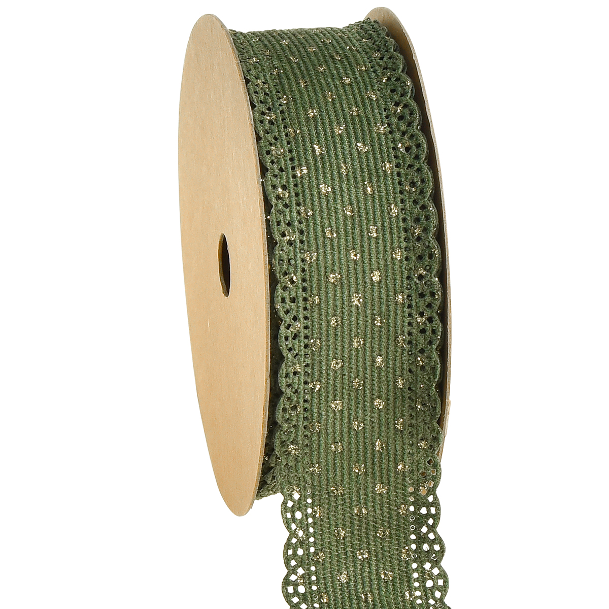Fremhev gavene dine eller avgrens dekorasjonene dine med vårt utsøkte dekorative bånd: det grønne båndet med gullprikker og blonder. Et høydepunkt i hver gaveemballasje og hver dekorative kreasjon!