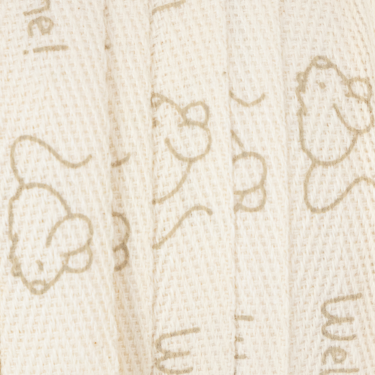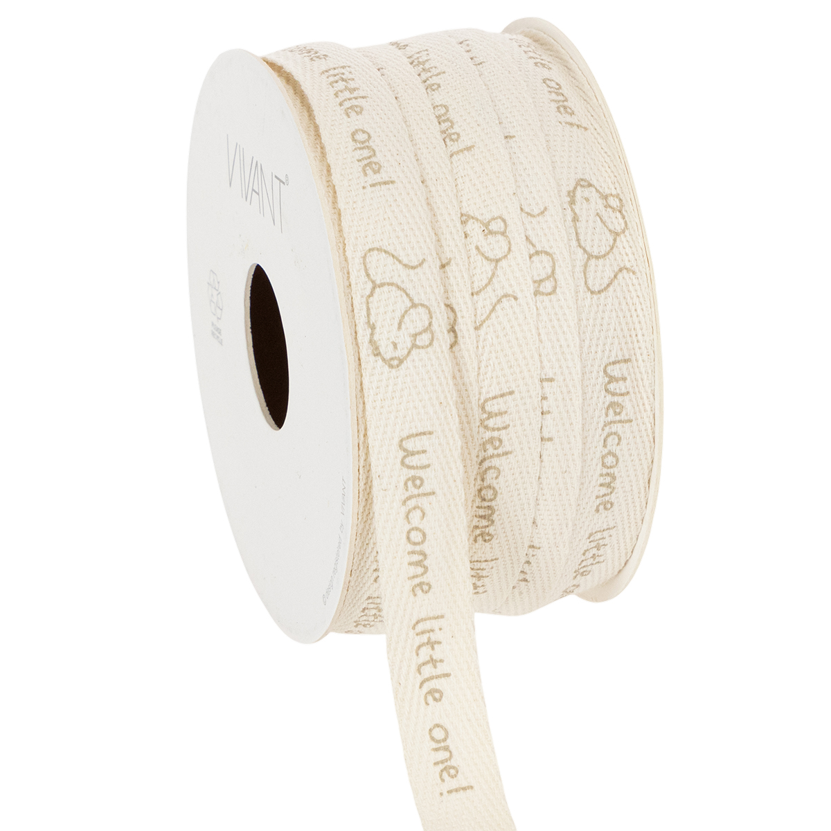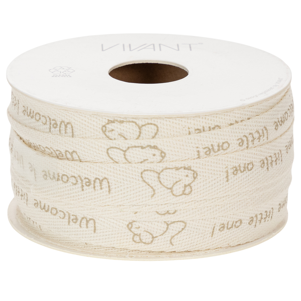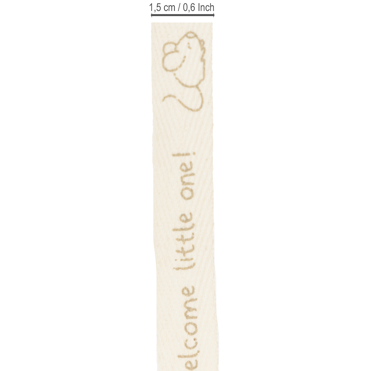 Nysgjerrige mus og hilsenen «Velkommen lille!» er trykket i lysebrunt på det kremfargede båndet laget av ren bomull. Det dekorative båndet laget av naturmaterialet bomull er biologisk nedbrytbart og er på en pappsnelle for mer bærekraft. Det betyr at dåpsdekorasjonen ikke krever noe plast.