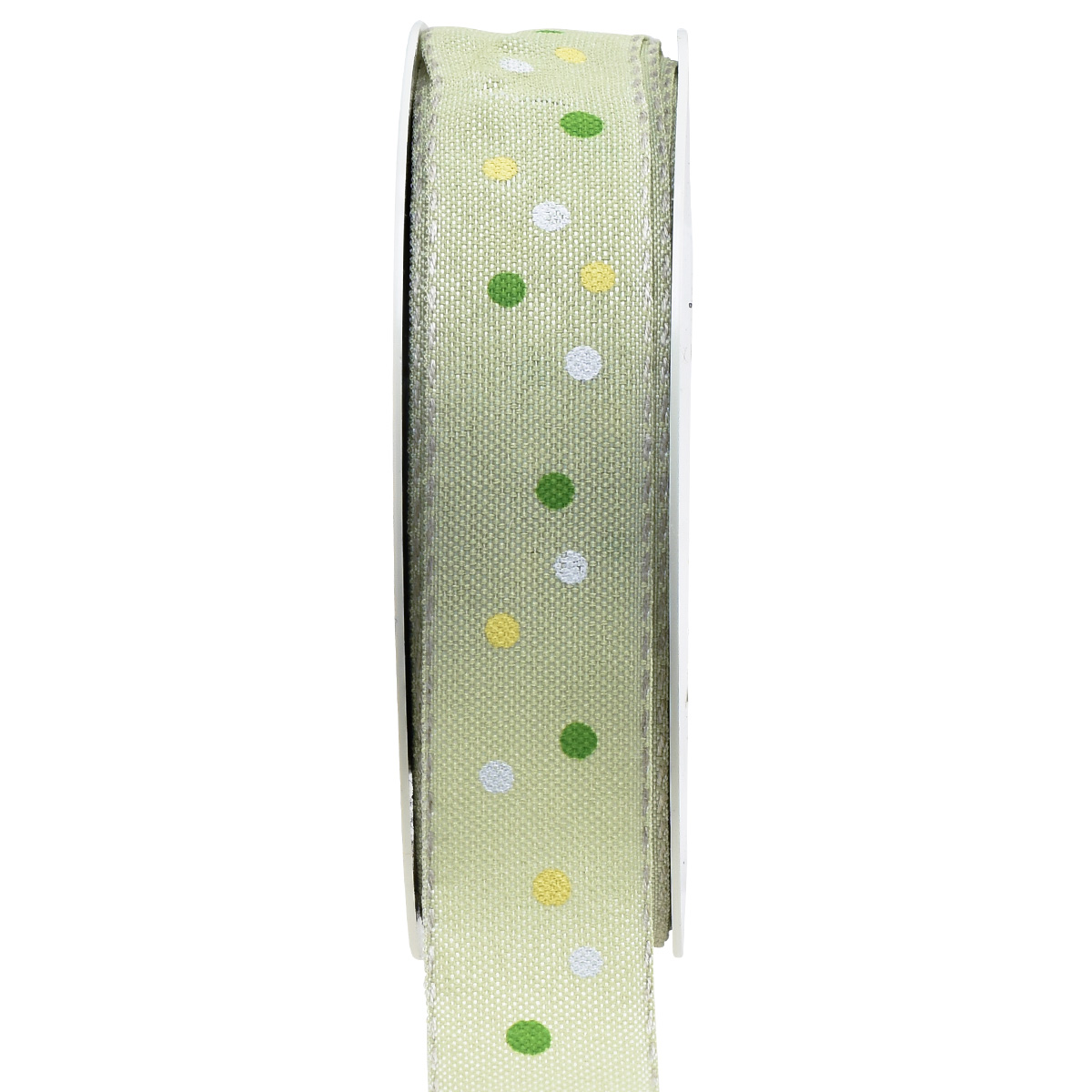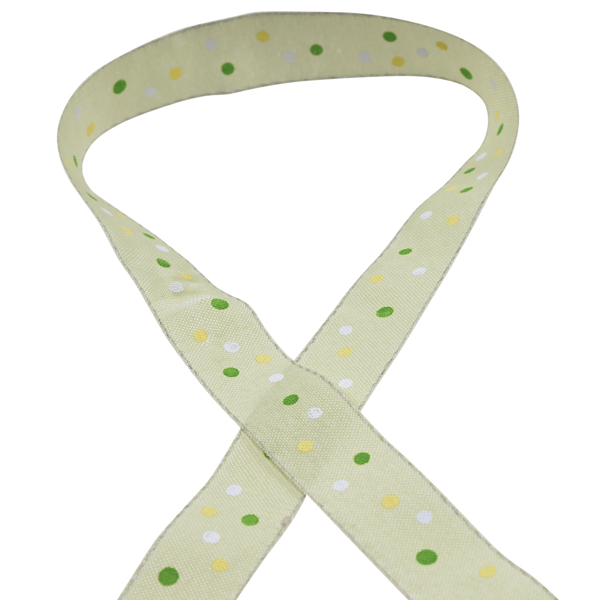 Prikkene i gult, hvitt og mørkegrønt er trykt på båndet i et løst, dansende mønster. En ideell fargekombinasjon for det dekorative båndet på den lysegrønne bakgrunnen. Til slutt, sydde kanter laget av lintråd foredler stoffbåndet. Dette får bandet til å se enda mer høykvalitets ut!