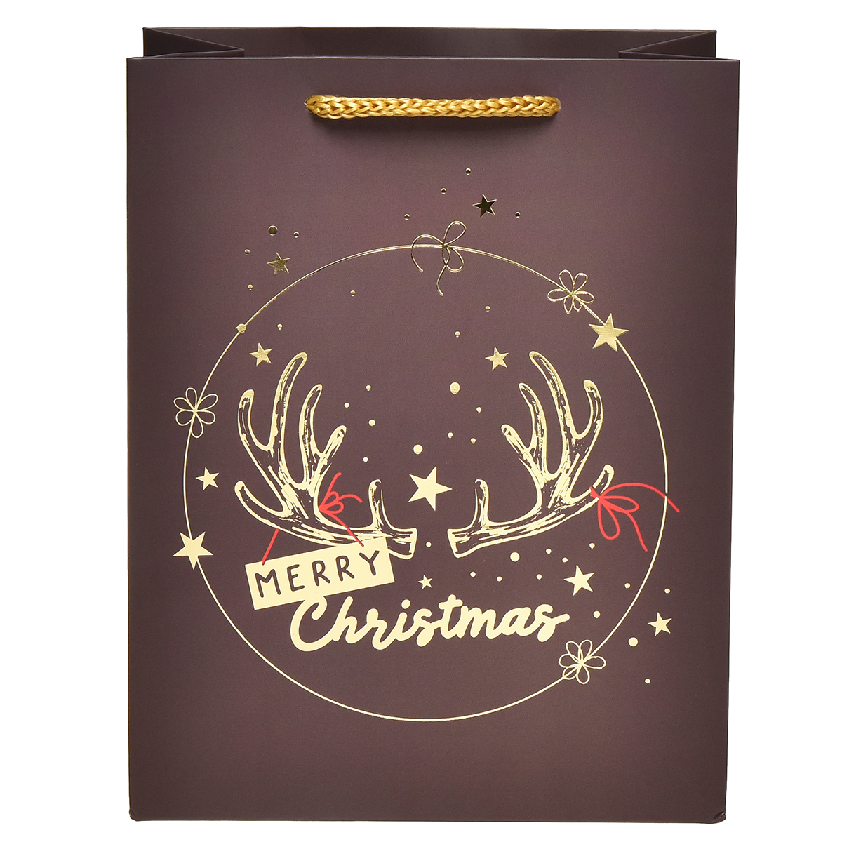 En julegaveutdeling begynner med førsteinntrykket. Vår brune gavepose med festlige gullaksenter og et skinnende gullgevir med rød sløyfe vil fremheve enhver gave. Dekorative stjerner og ordene "Merry Christmas" gir denne vesken et glamorøst utseende som vil få mottakerne til å skinne. Med sine skreddersydde mål på 18x10x23cm er den ideell for en rekke julegaver, mens den gyldne snoren ikke bare er praktisk, men også et ekstra blikkfang.