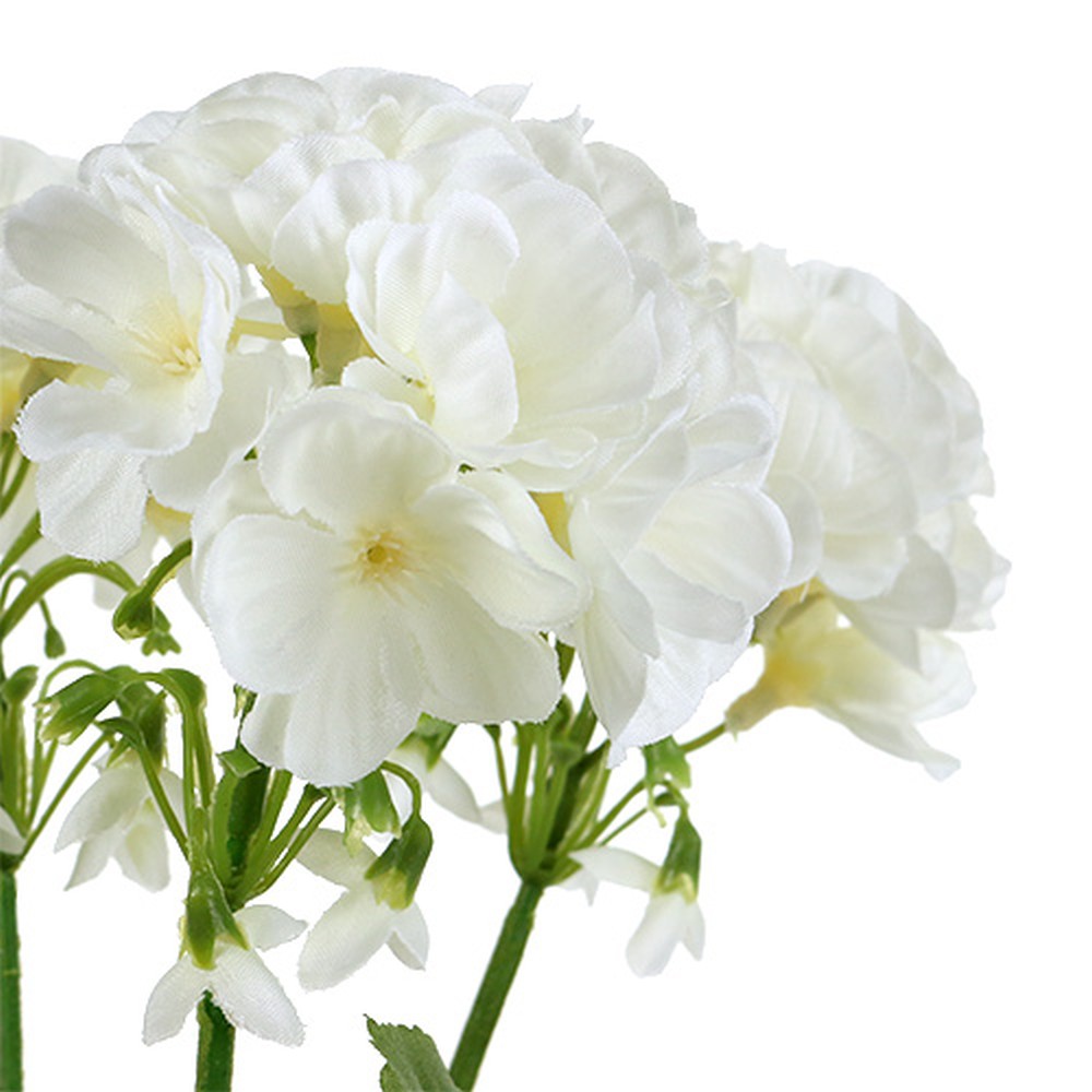 Den kunstige geraniumbusk har en solid stamme laget av grønn plast, som flere stammer med blader og hvite blomster laget av silke stoff er festet til. Den kunstige blomsten er omtrent 36 centimeter totalt, med blomsterstandene hver med en diameter mellom 3 og 9 centimeter.