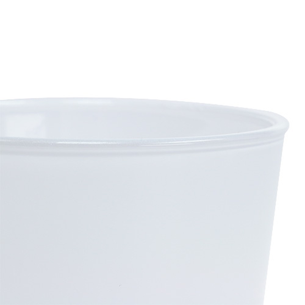 Den lille cachepotten er laget av solid glass, som er nesten ugjennomsiktig takket være den hvite fargen. Den har en total diameter på omtrent 10 centimeter, åpningsdiameteren er omtrent 9 og høyden ca. 8,5 centimeter. Fotavtrykket er omtrent 8 centimeter.
