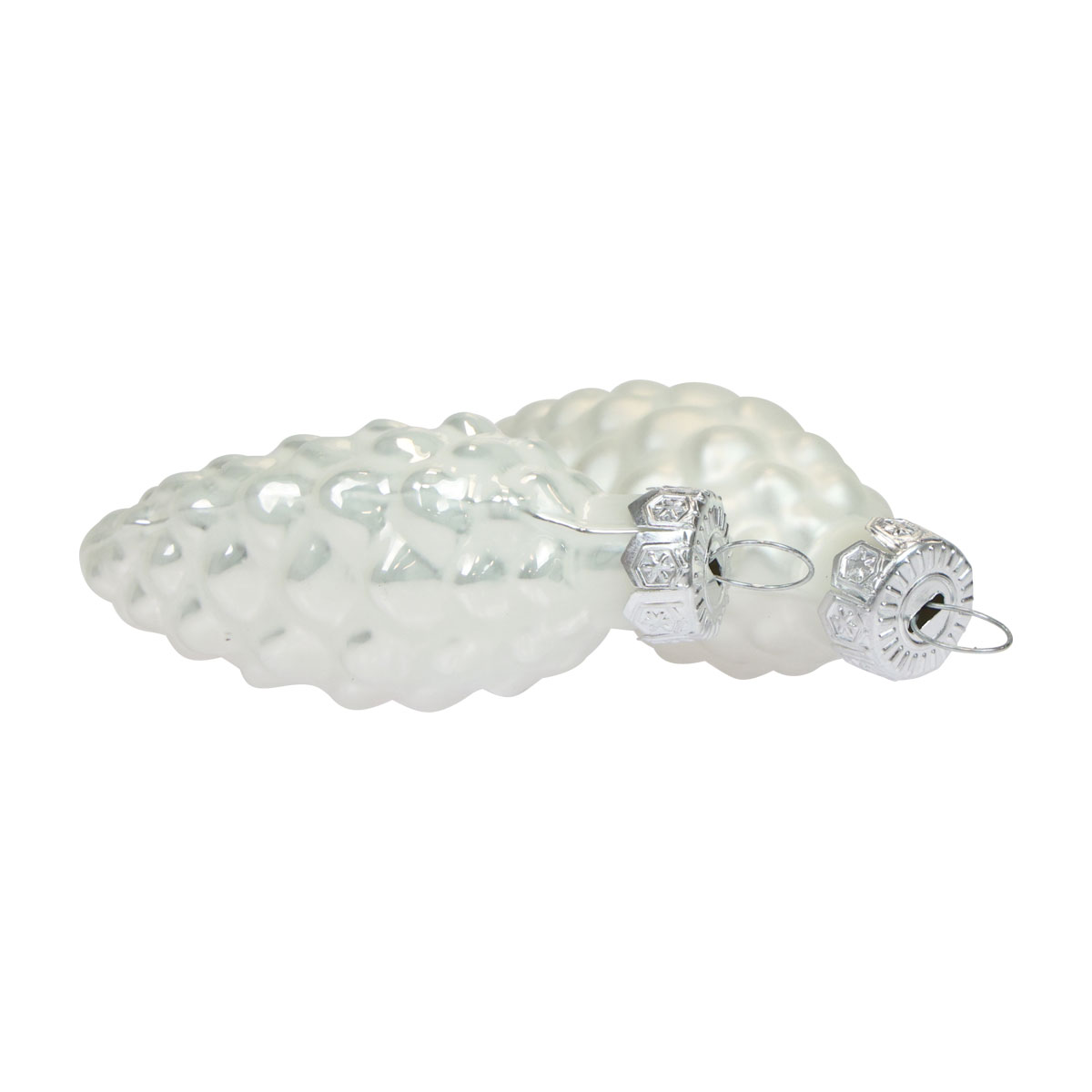 Du vil motta vinterhvite glasskjegler med denne julepynten. Juletrepynten i glass er matt og skinnende.Mens de matte glasskjeglene er ugjennomsiktig dekket med det hvite laget, har de blanke kjeglene skjellene delvis eksponert. Det blanke laget under kan sees og får julepynten til å glitre magisk.