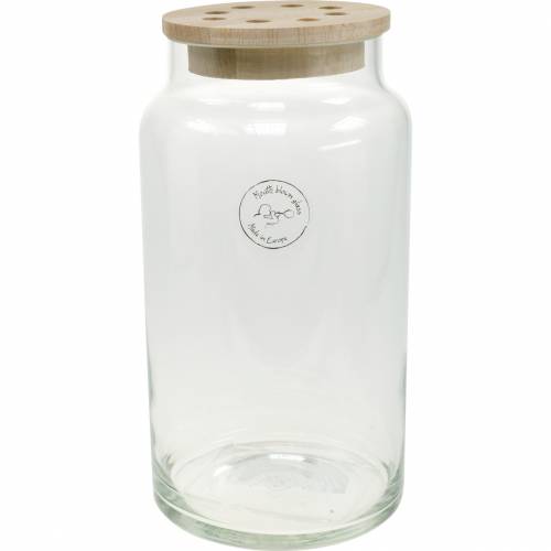 Den høye, klare glassbeholderen er sylindrisk og er lukket på toppen av en smalere åpning. Kanten er nøye pusset og kan lukkes med et treffende trekklokk. Lokket er laget av naturlig massivt tre slik at det har et unikt stripet mønster. Det dekorative høydepunktet: åtte hull lar deg enkelt og presist ordne stengler.