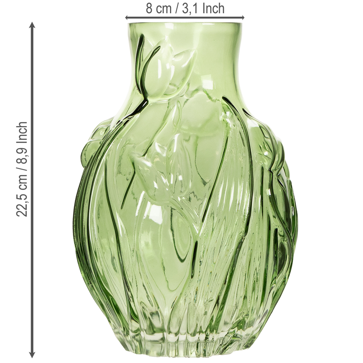 Har du noen gang sett en vase som er så sjarmerende og stilig at du bare må ha den? Vår grønne tulipanvase i glass med preget tulipandesign kan være akkurat den perlen for hjemmet ditt. Med sin attraktive grønne farge og perfekt gjennomtenkte form kombinerer den tidløs design med funksjonalitet. Enten du plasserer den på et skjenk, et spisebord eller på soverommet ditt, er denne vasen garantert et blikkfang!