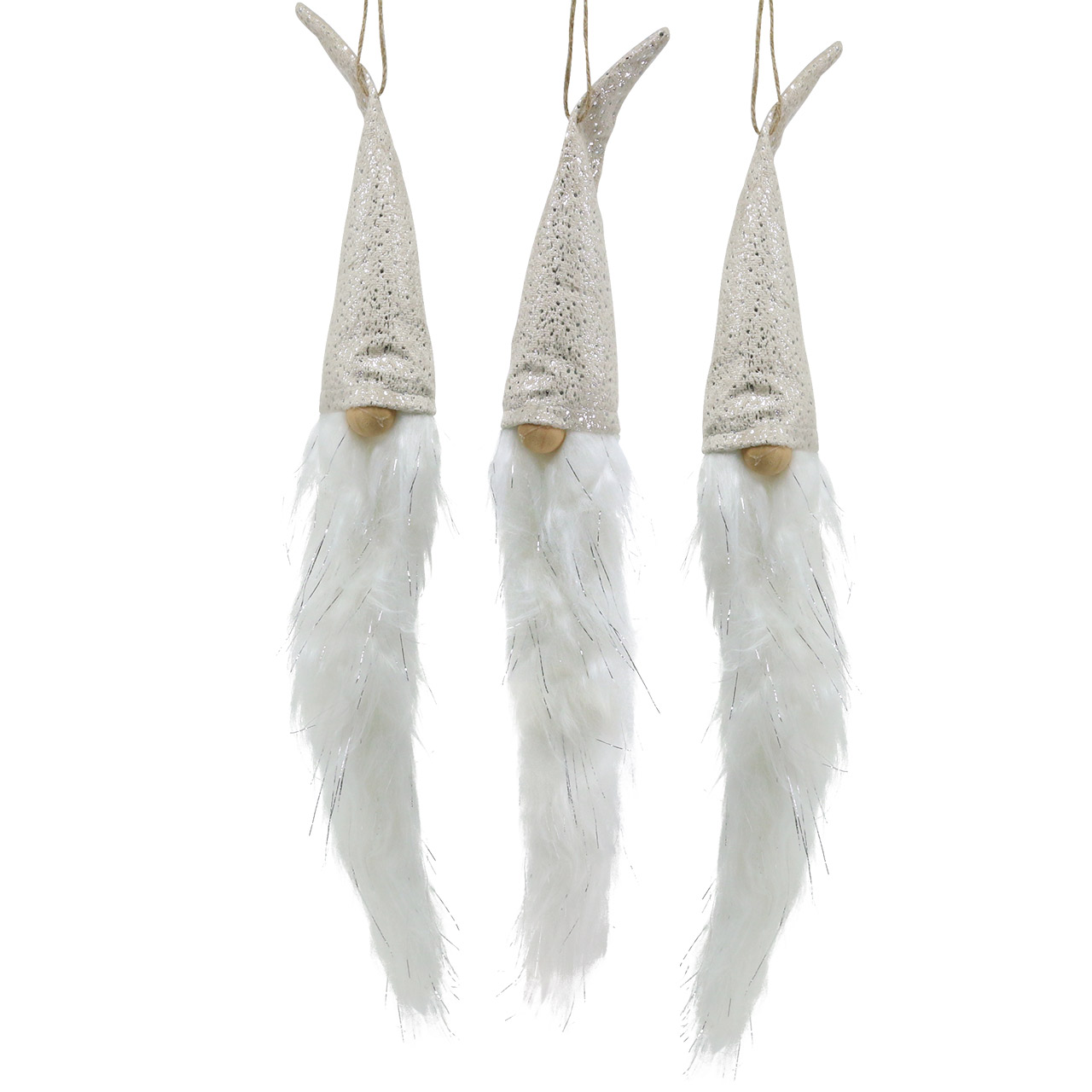 Du får gnomen med spiss hatt til å henge i et sett med 3 stykker. Jule-nissene er alle designet identisk. Gnomene for henging har en total lengde på ca 57 centimeter med bånd, de dekorative figurene er ca 48 centimeter høye.