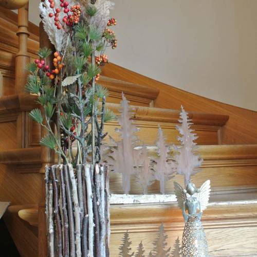 Med denne rustikke gran-silhuetten av VIANA kan du legge til et sjarmerende høydepunkt i høstdekorasjonen. Metallgranene er dekket med en dekorativ patina laget av edel rust. Takket være det kobberlignende fargevalget harmonerer slike rustelementer veldig godt med naturlige toner av tre og fargerike høstløv. Skogens silhuett er festet til den hakkede kurven til en delt bjørkestamme og består av to store grantrær, to mellomstore trær og et lite grantre.Metallgran silhuett er ideell for plassering på skjenk eller vinduskarm. Spre litt mose eller dekorativ snø rundt og tilsett noen få dekorative rådyr eller rådyr. - En tiltalende skogsdiorama til høsten eller adventsdekorasjonen din er klar.