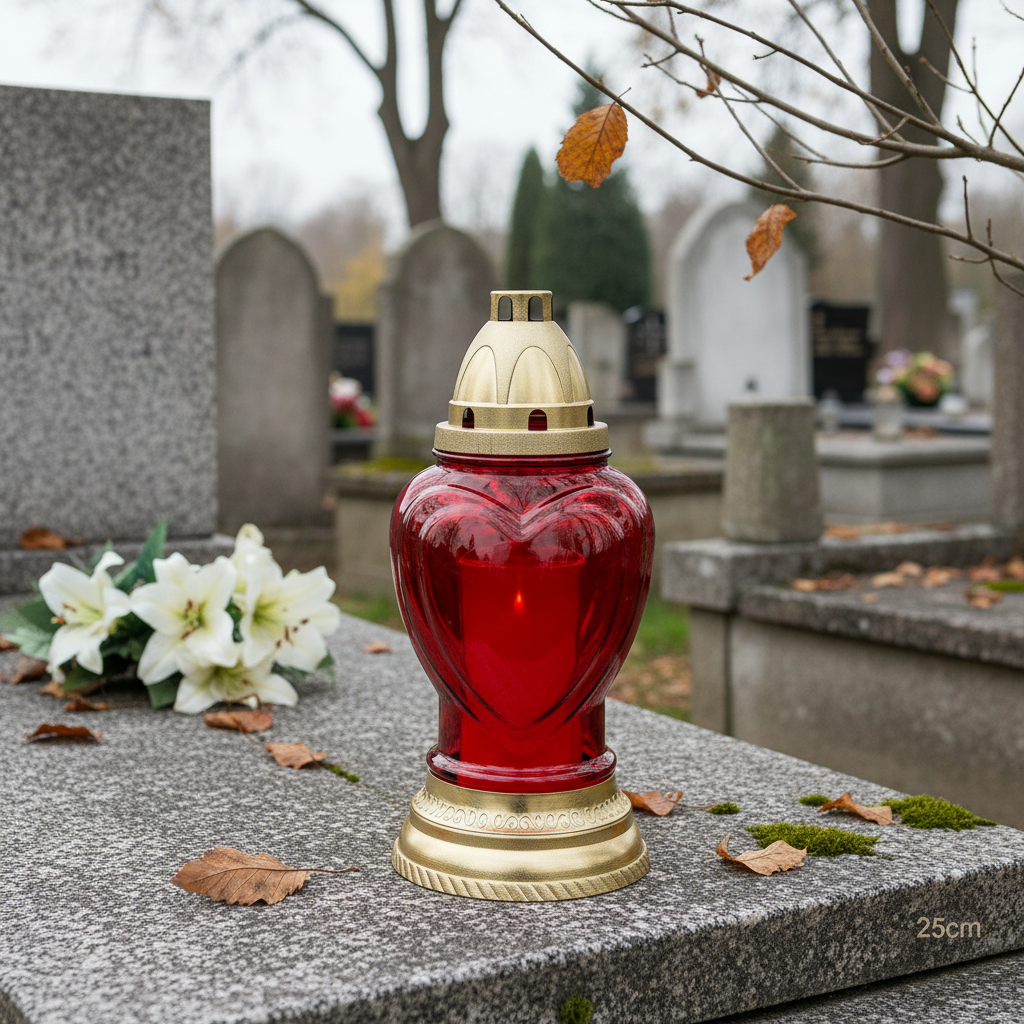Denne gravlykten i glass, dekorert med et hjerte, er en attraktiv minnelykt. Den røde og gullfargede gravlykten har en kuppelformet base og lokk, og er spesielt dekorativ.