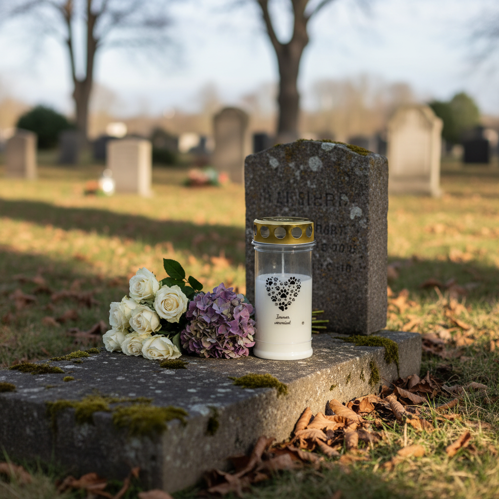 For alle som har mistet en elsket hund, tilbyr gravlyset vårt i hvitt og gull en verdig måte å bevare minnet på. Dette dyregravlyset med hjertemotiv laget av potetrykk fortryller med sin enkle eleganse og passer harmonisk inn i ethvert minnesmerke med sin klassiske design.