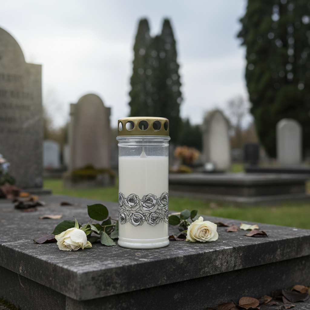 Dette hvite gravlyset er en kombinasjon av sølv og gull. Rosen blomstrer på kanten skinner sølv, mens lokket er gullfarget.