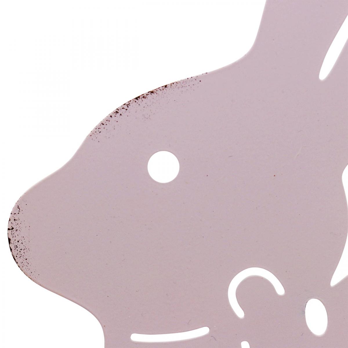 Med spidse ører sitter kaninen oppreist på de to pinnene som fungerer som plugger. Den varme fargen på syrin og de myke, glatte kantene gir inntrykk av at materialet som ble brukt var noe annet enn metall, som ofte omtales som kaldt. I tillegg har kaninsilhuetten en bueformet utskjæring ved kaninens hals. En fin stor sløyfe, til og med båndene er kunstferdig buet på påskepynten. Halsen er også sporet i små, lett buede riller. Et vakkert, fredfullt helhetsbilde til påskesengen!