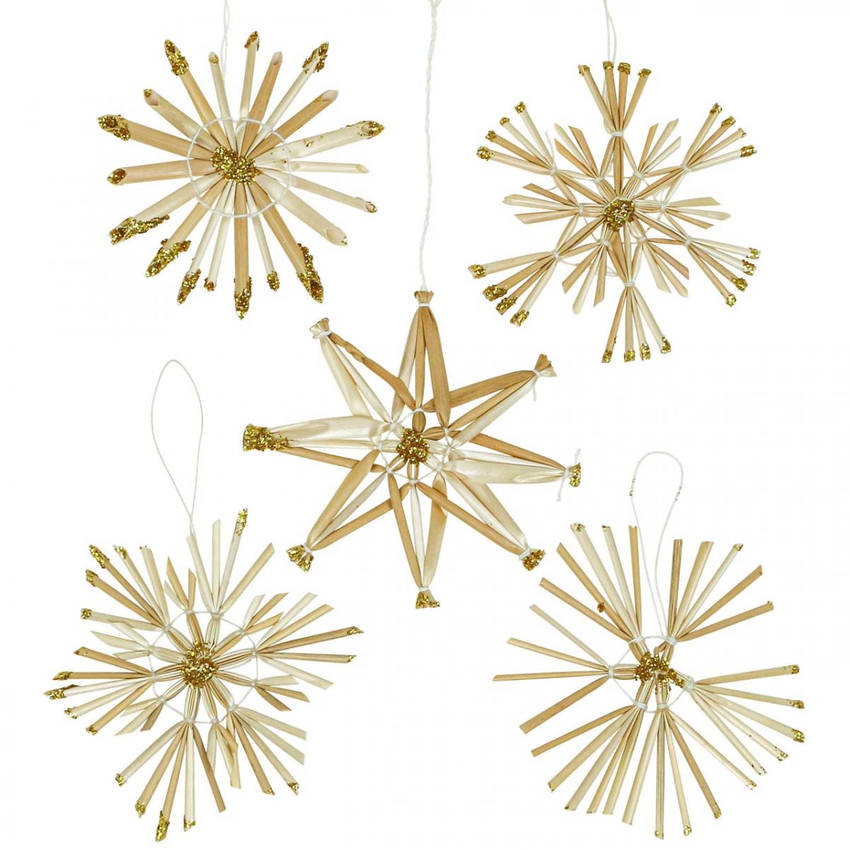 Noen minner om en stjerne, mens andre minner om et snøfnugg. Så du har massevis av valg av julemotiver. Halmstjernene er bundet med hvit tråd. Denne fungerer også som tilhenger.