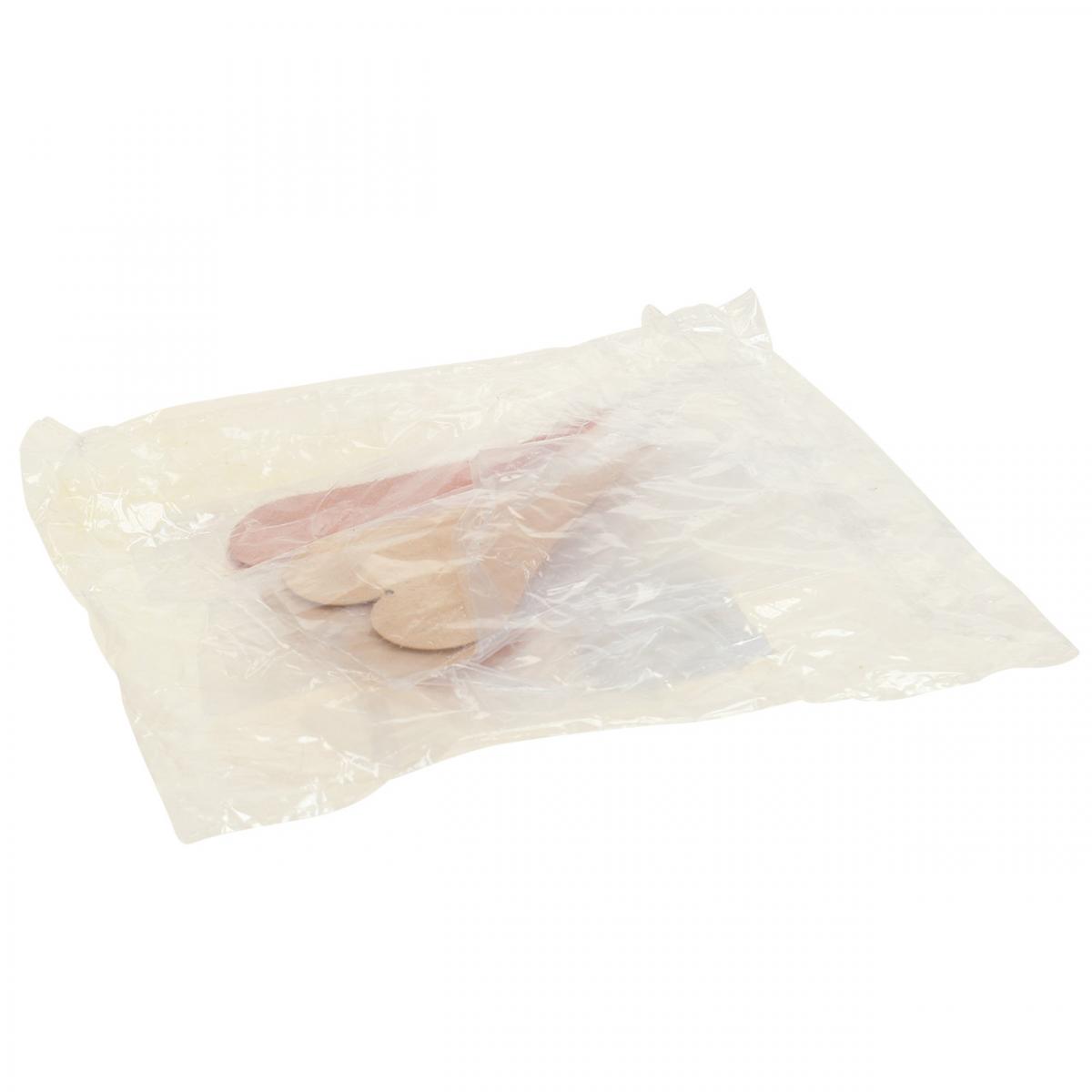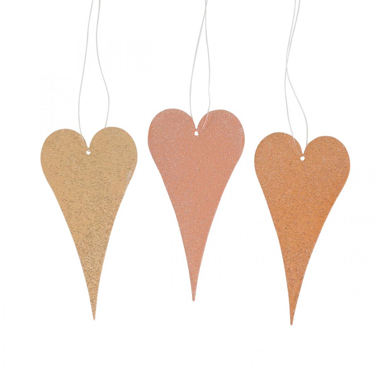 Du vil motta totalt seks dekorative hjerter å henge. Hjertebeslagene er ca 10 centimeter høye og kommer assortert i tre farger, så du får to av hver i fersken, laks og gul.