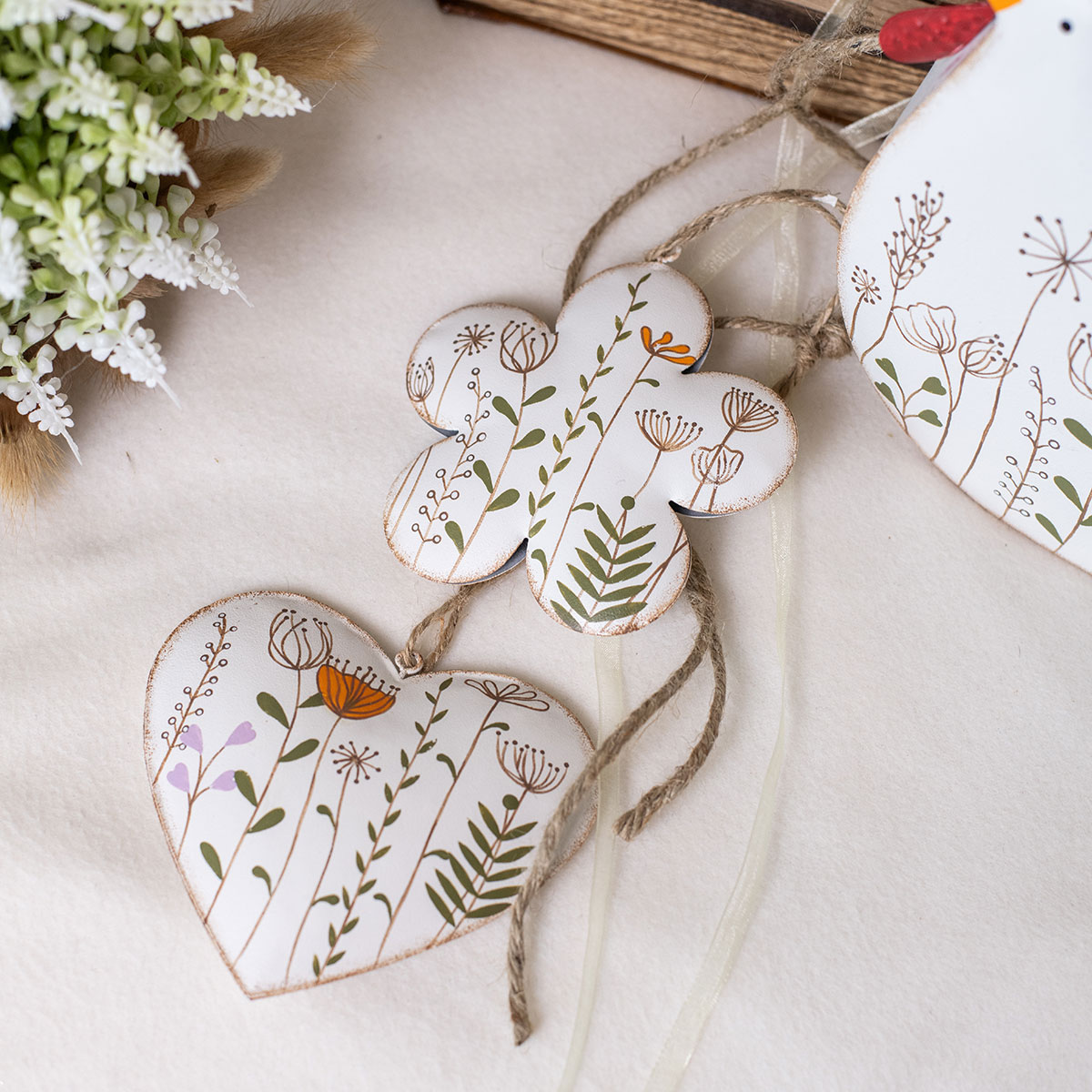 Baksiden av de dekorative kleshengerne er ganske enkelt hvite, men er også dekorert med rustfargede slitasjemerker. Hengene laget av naturfiber passer perfekt til denne hengende dekorasjonen.