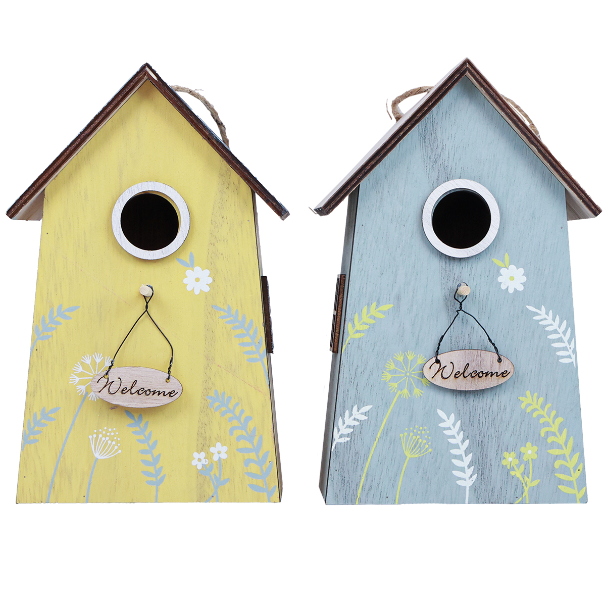 Hvert av de dekorative fuglehusene er utstyrt med en jutesnor for oppheng, som trekkes over toppen av takgavlen. Fuglehusdekorasjonen kan fint henges som veggdekor eller hengende dekorasjon på vinduet.