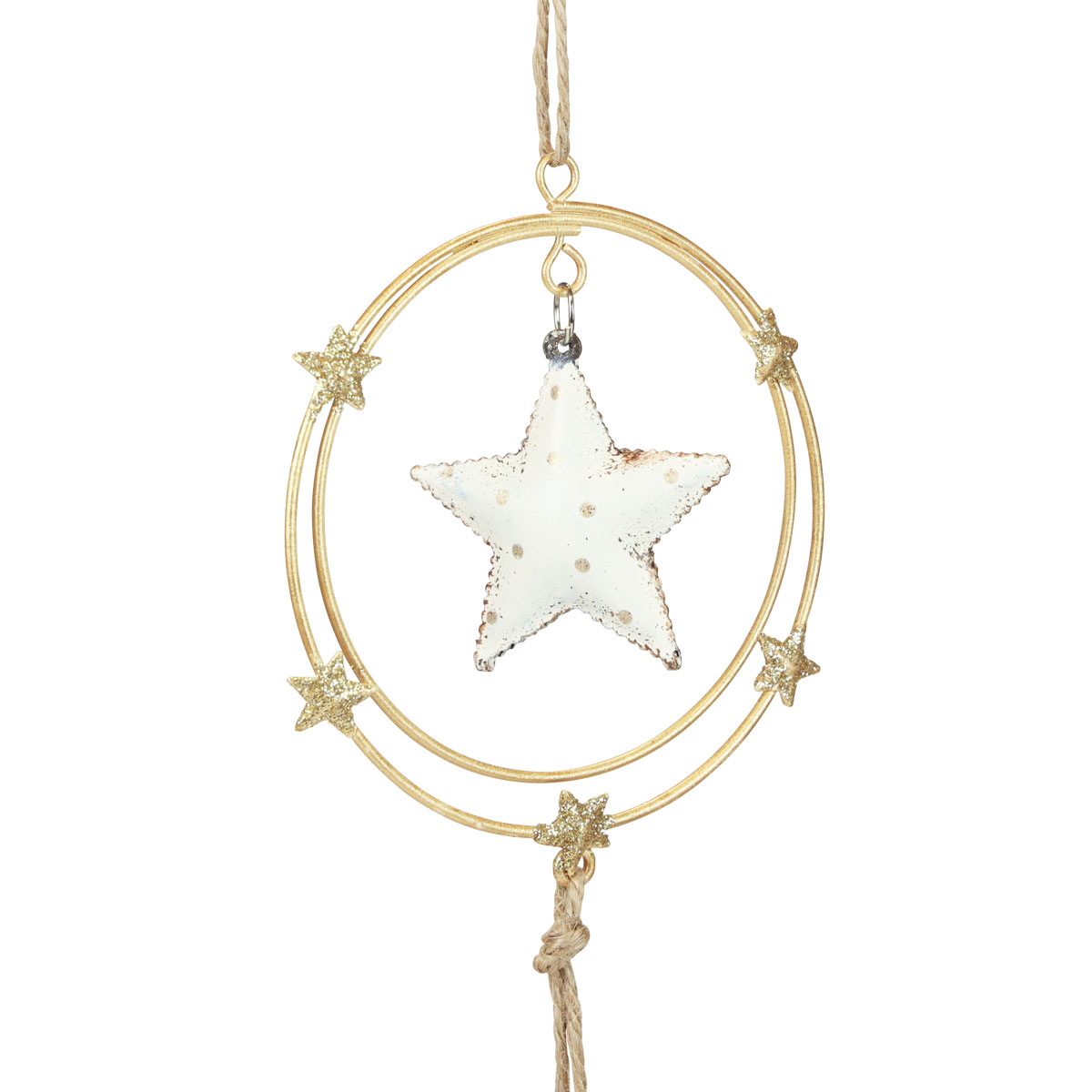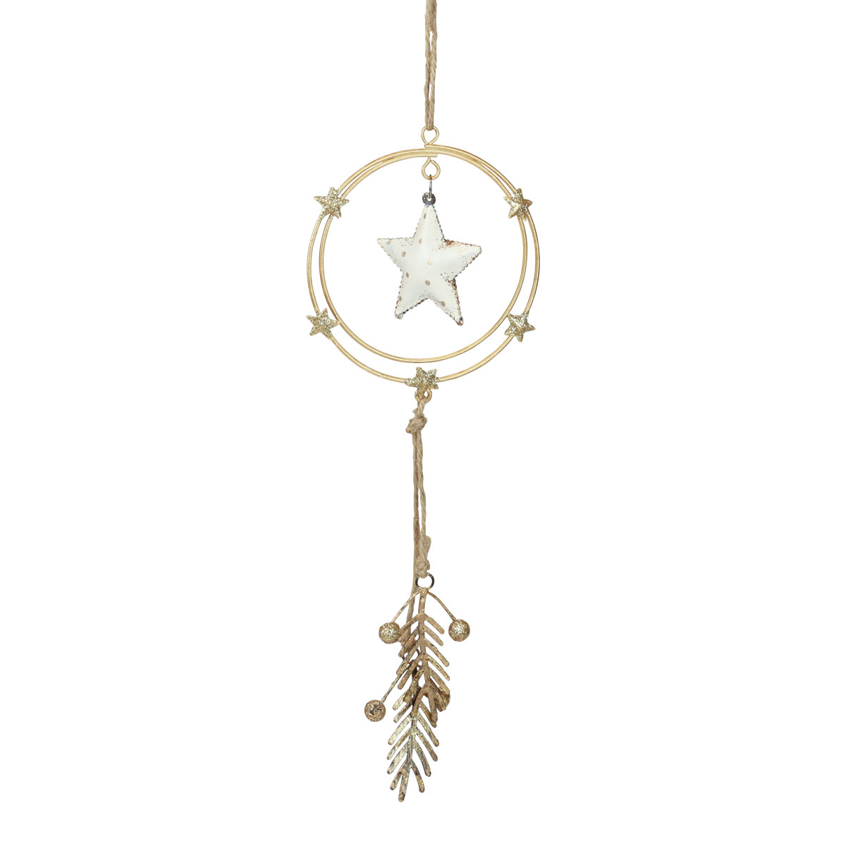 Den dekorative hengeren består av en gyllen ring med en gyllen prikket metallstjerne, glitrende gylne bær og filigrangrener. Det er også festet små glitrende stjerner på selve pynteringen - en allround festlig hengende dekorasjon til jul!