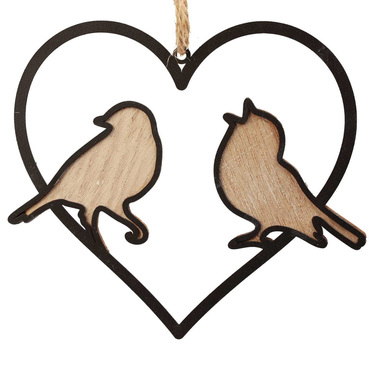 Fuglefigurene i tre er nøyaktig tilpasset konturene av svart metall. Treet på dekorasjonen er lett bleket for oppheng, noe som passer perfekt til jutesnorhengeren. På baksiden kan du se fuglefigurene uten metallrammen.