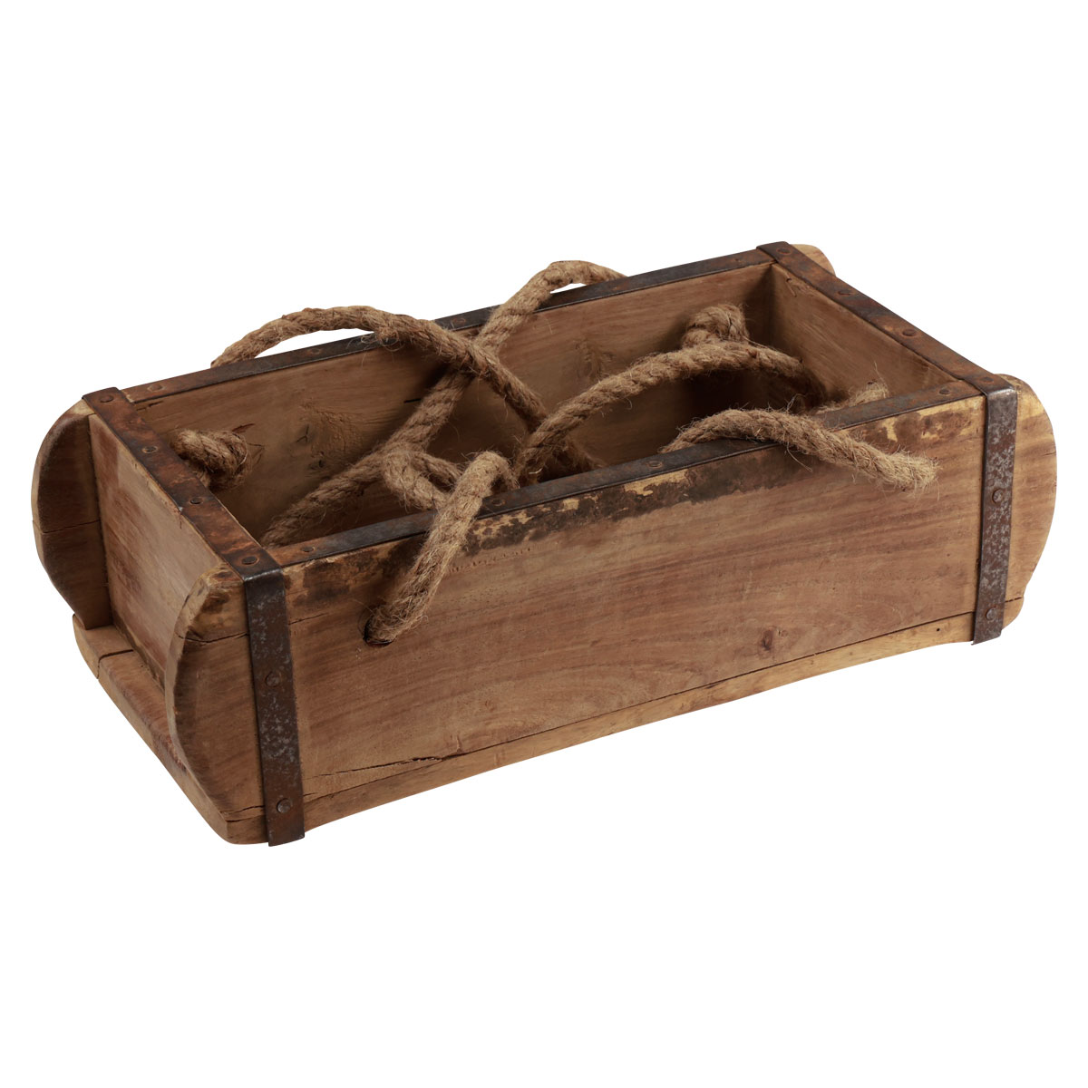 Oppusset uten å miste den gamle sjarmen, er denne formen nå en treboks i rustikk vintagestil. Takket være de festede tauene kan treplantekassen brukes på en fantastisk måte som hengende kurv.