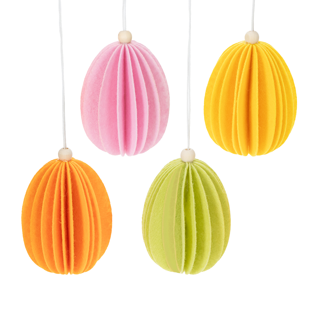 Dette settet med åtte påskeegg av papir er ideelt for alle som elsker en naturlig, men likevel munter atmosfære. De hengende påskeeggpyntene er enkle å feste til vinduer eller grener. Fargeblandingen – myk rosa, frisk grønn, solgul og livlig oransje – gir påskepynten din et lekent, men balansert preg. Enten du ser etter en sjarmerende landlig stil eller en moderne, minimalistisk påskestemning, er disse pyntene perfekte.