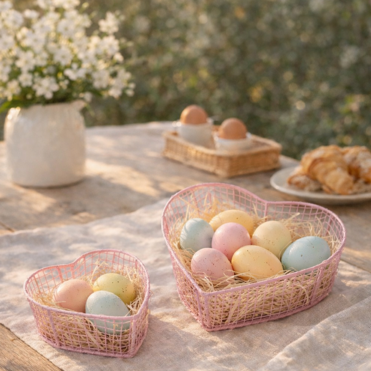 Skap en romantisk, men organisert atmosfære med disse vakre hjerteformede trådkurvene. Enten de brukes som et dekorativt element på bordet, til oppbevaring av småting eller som et stilig gavesett, bringer disse hjerteformede metallkurvene kjærlighet og orden til hjemmet ditt. Kurvene er laget av solid metall og kommer i myke rosa og lilla toner. De er perfekte for bruk i oppholdsrom eller skjermede uterom, og er det ideelle valget for romantisk borddekorasjon ved spesielle anledninger som bryllup, Valentinsdagen eller bursdager.