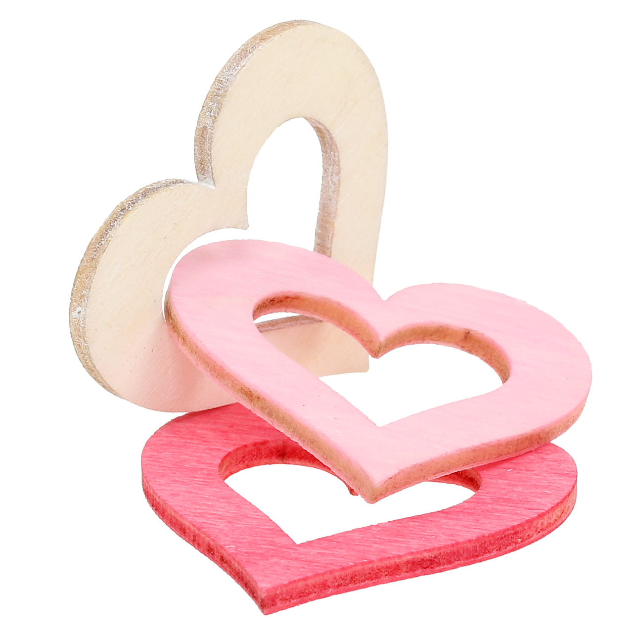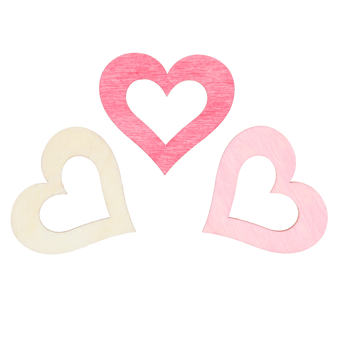 Du får hjertene til å spre seg i rosa, rosa og naturlig i et praktisk sett på 72, levert i en plastboks. Du finner 24 eksemplarer av hver farge, rosa, rosa og naturlig. Tykkelsen på de utstansede tredelene er rundt 3 millimeter, diameteren er rundt 4 centimeter.