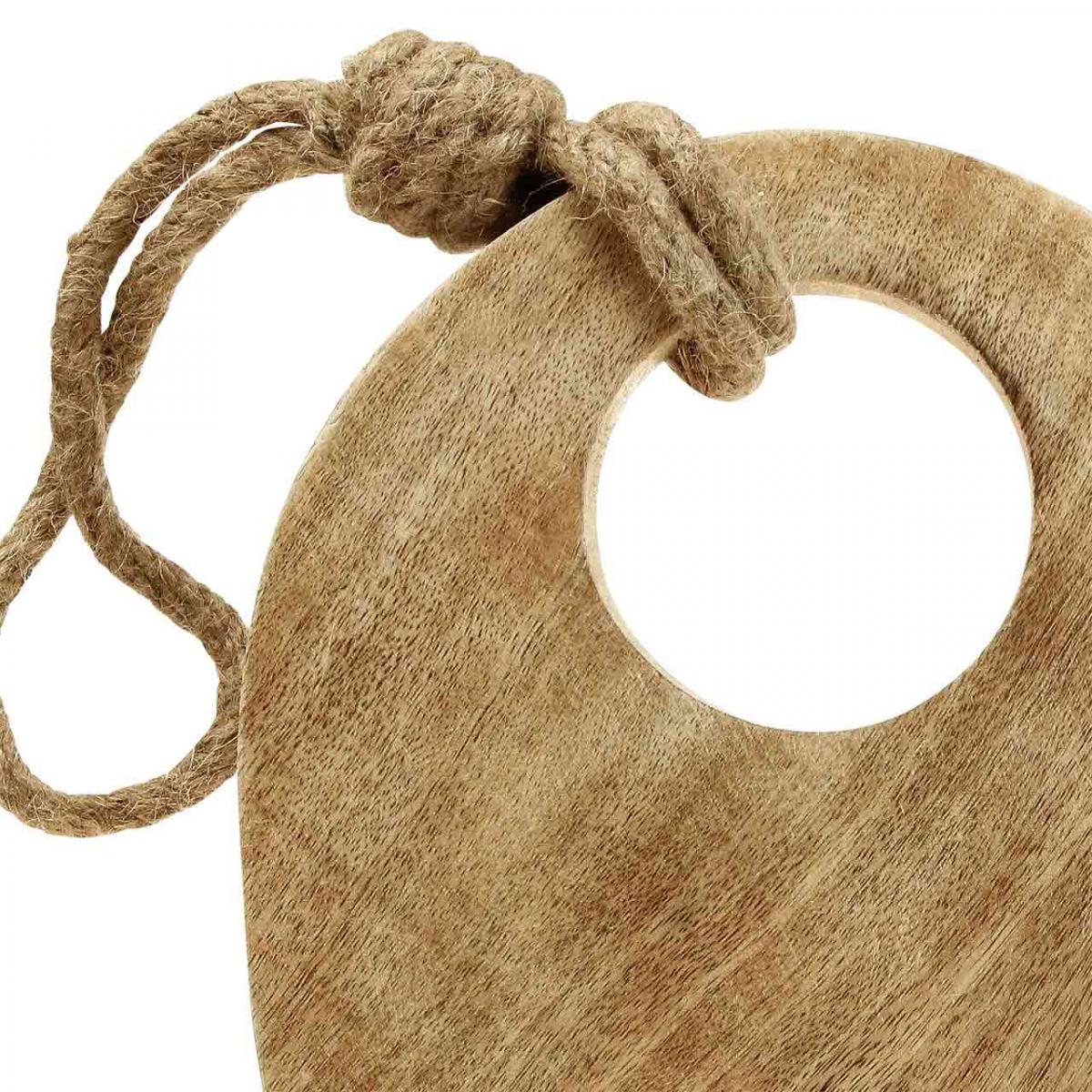 Trehjertet viser seg fra begge sider i et naturlig utseende. Årverket i treverket som brukes til hjertedekorasjonen er slående. En rund utsparing på en av de øvre kurvene fungerer som holder for den flettede hengeren. Denne består igjen av grove naturfibre og har styrken som et tau. Hengeren skal også være sterk. Tross alt veier den rustikke dekorasjonen en god kilo.