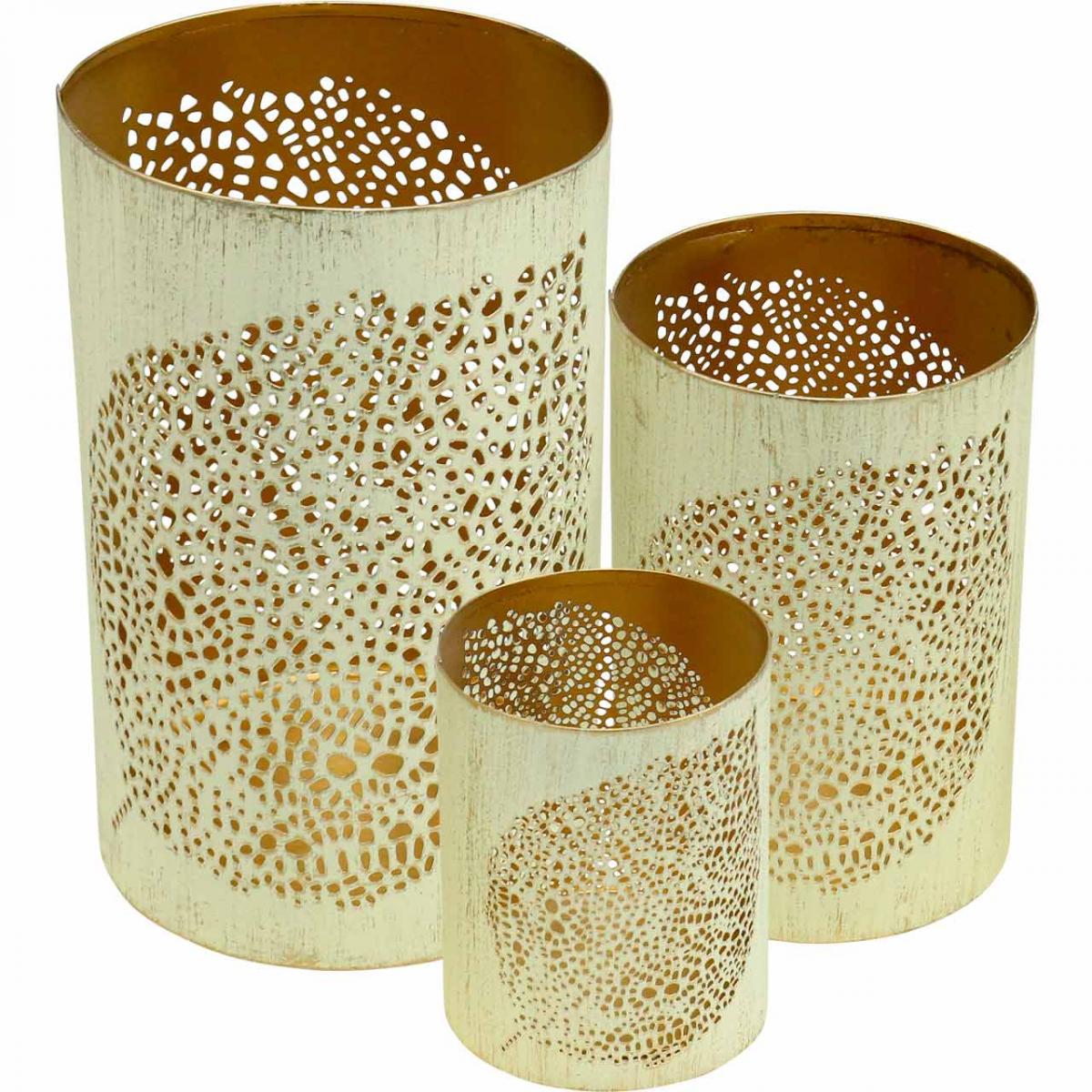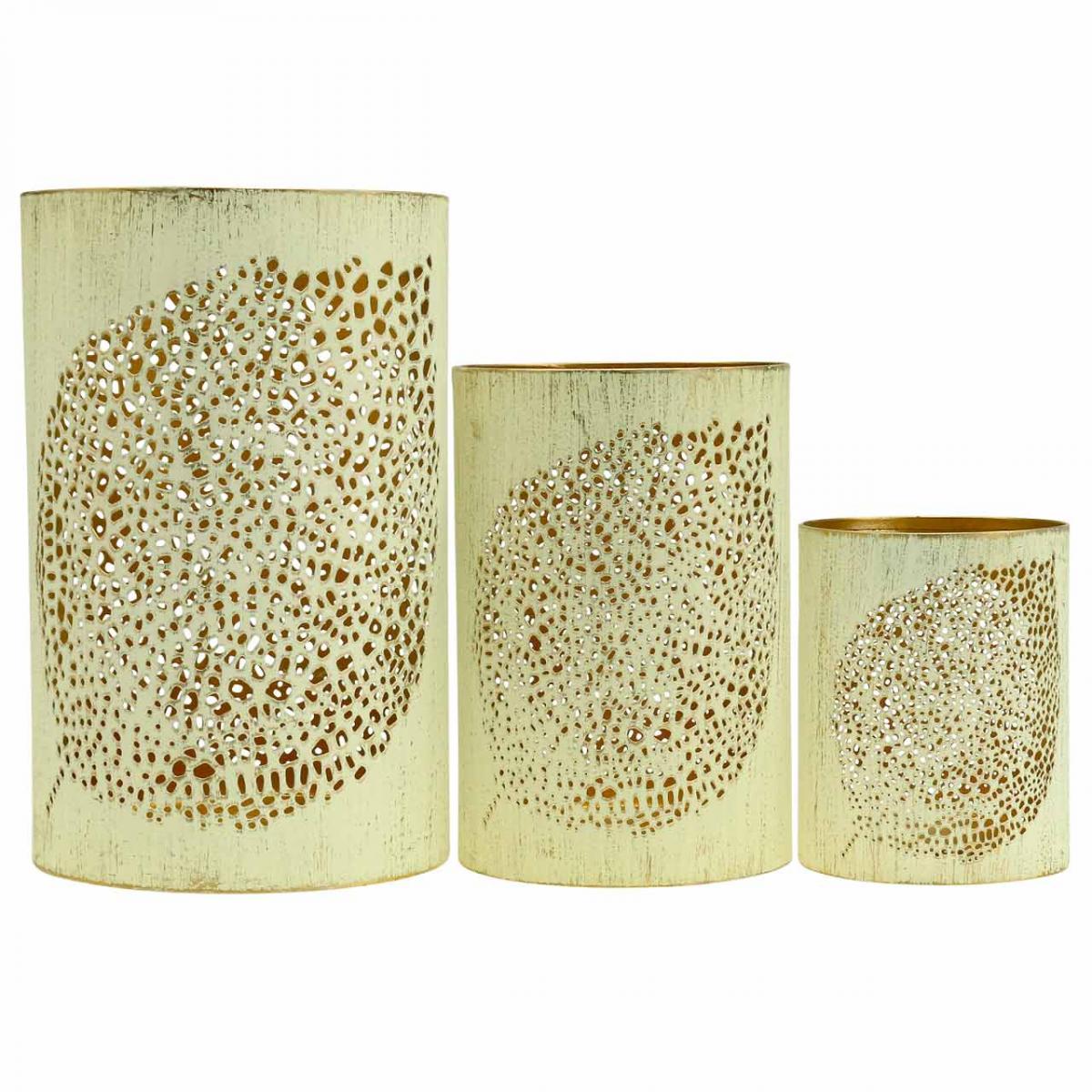 De dekorative bladene på lyktene består av mange uregelmessig formede ovaler, som kunstferdig bryter gjennom metalldekorasjonen og gir et glimt av interiøret. Hver høstlykt er designet i matt gull på innsiden og har en kremfarget vask på utsiden, noe som gjør den vakre lykten til en flott match til en shabby chic høstdekorasjon.