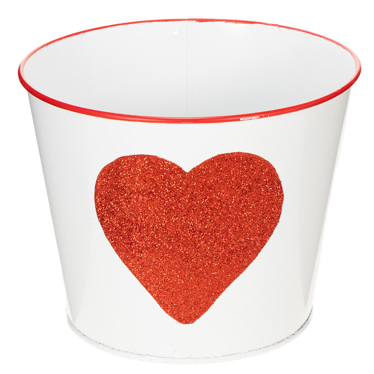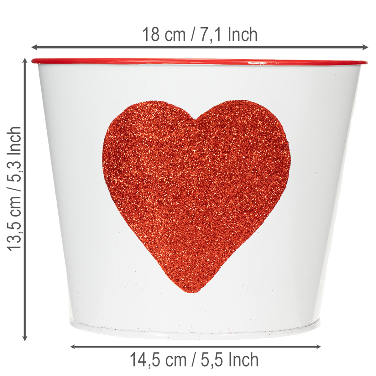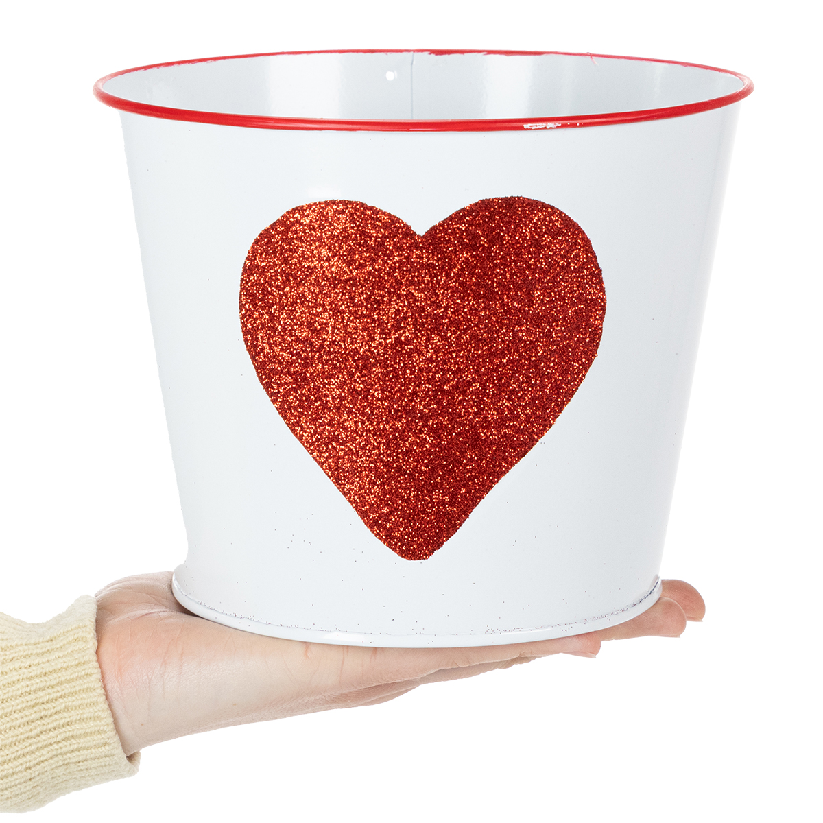 Denne blomsterpotten med den glitrende hjerteformen er den ideelle plantekassen for å gi orkideer på Valentinsdagen. Den hvite tinnbøtta har et veldig romantisk hjerte med rødt glitter og en rød kant i midten. Med et så klassisk design blir mamma også glad for en plante eller blomst til morsdagen.