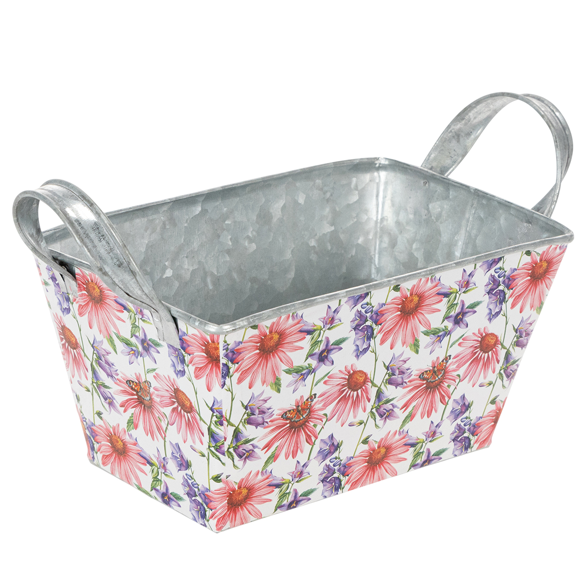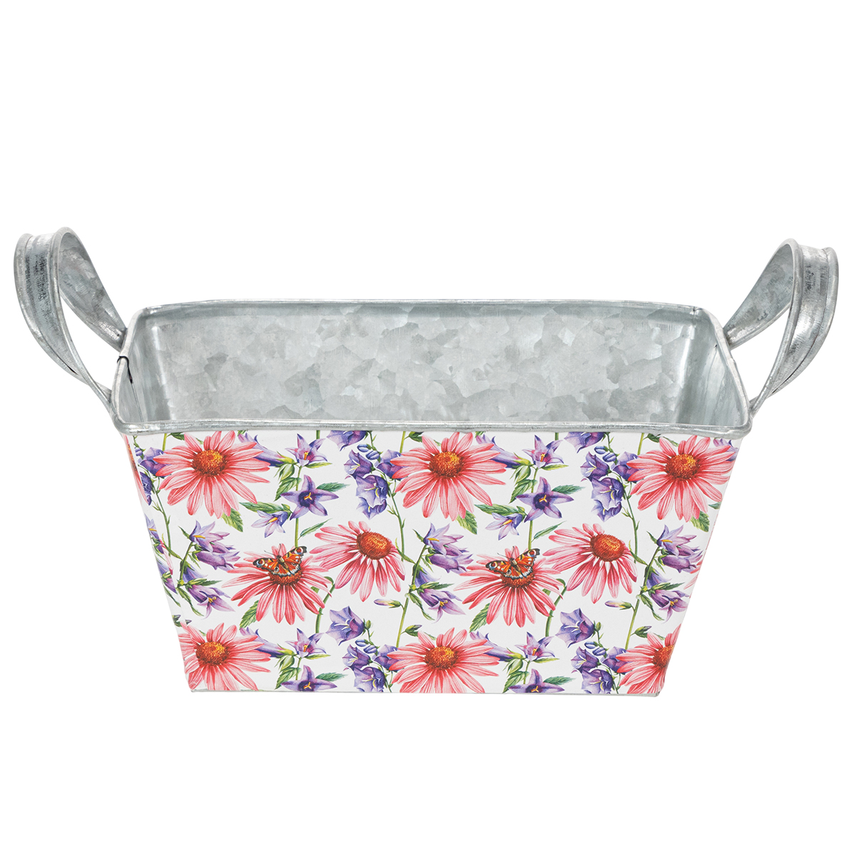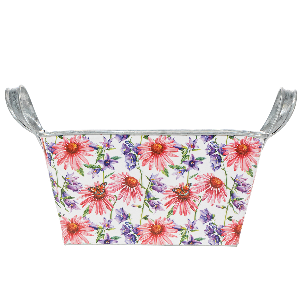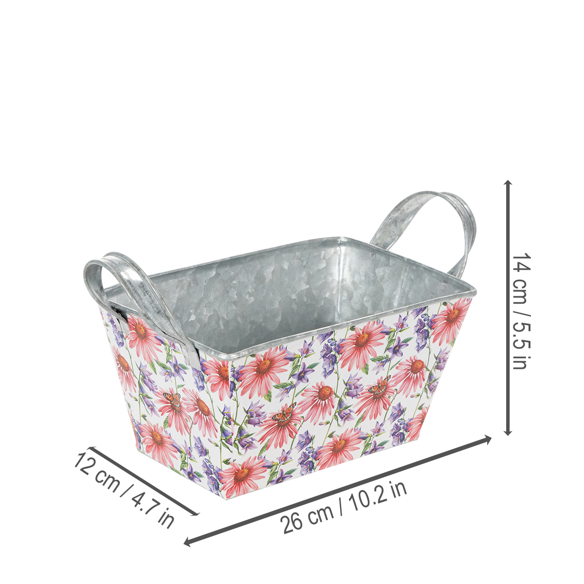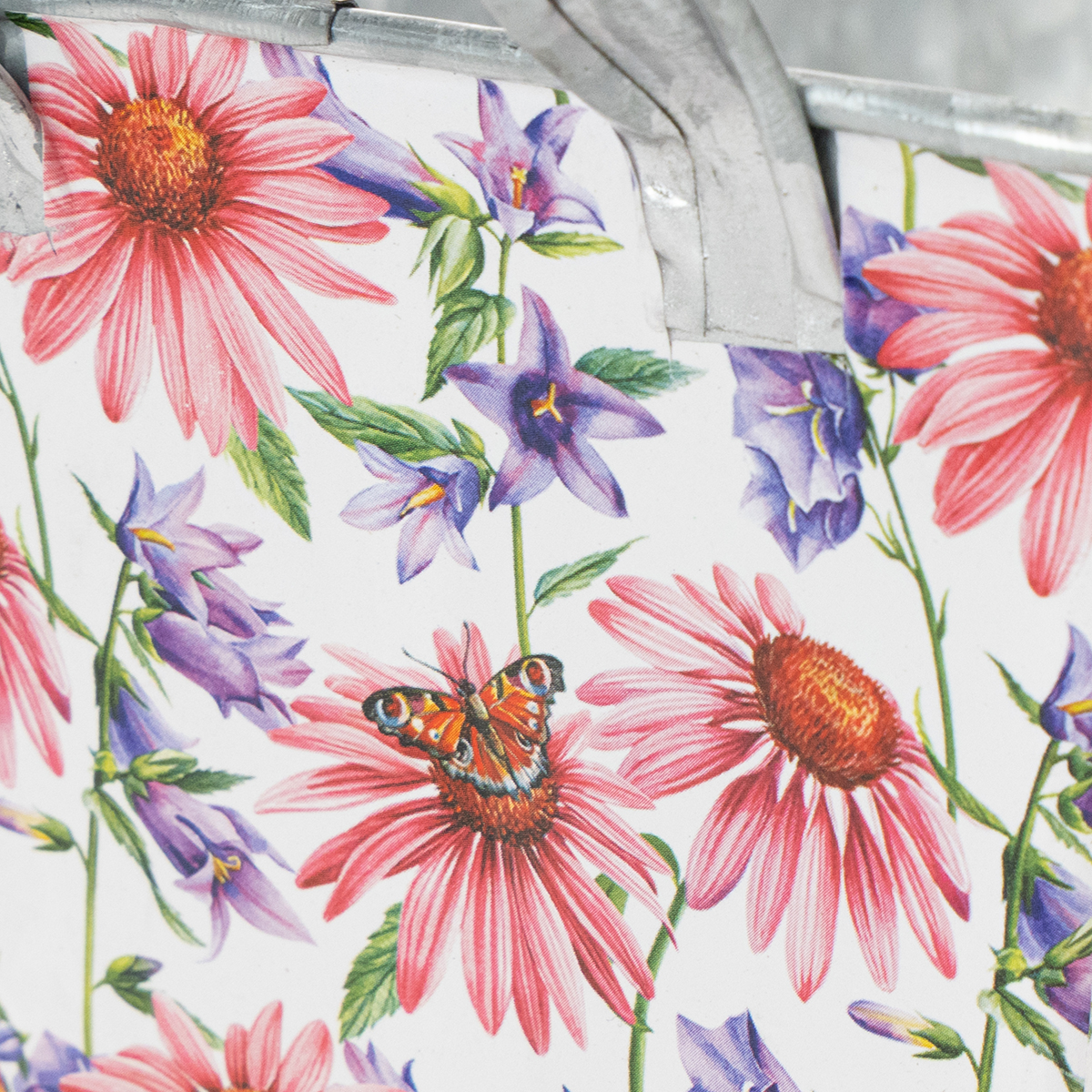 Rosa og lilla vårblomster på hvit bakgrunn skaper en variert og optimistisk ramme. Blomstermotivet er trykket på en kraftig folie, som igjen fester seg til sinkkaret. På denne måten danner innsiden med den sølvfargede sinken en sterk kontrast i vårdekorasjonen.