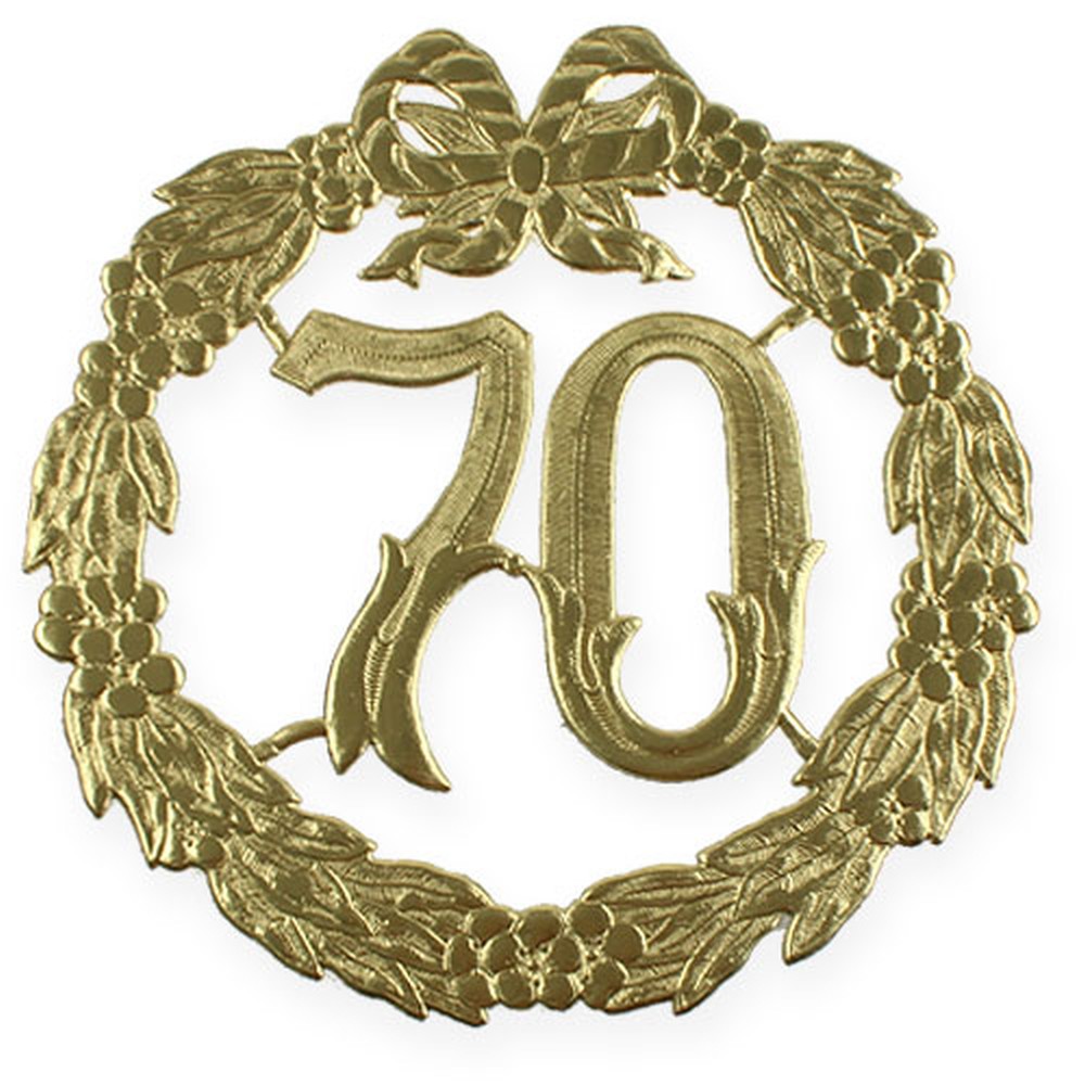 Det edle jubileumsnummeret “70” i gull måler rundt 24 centimeter i diameter. Behandlingen av høy kvalitet fra preget papp gir dekorasjonsnummeret i kransen et spesielt elegant utseende og lar deg også bruke det flere ganger. Og hvis du gir bort bursdagsnummeret, vil den som feirer jubileet huske den fantastiske feiringen i lang tid.