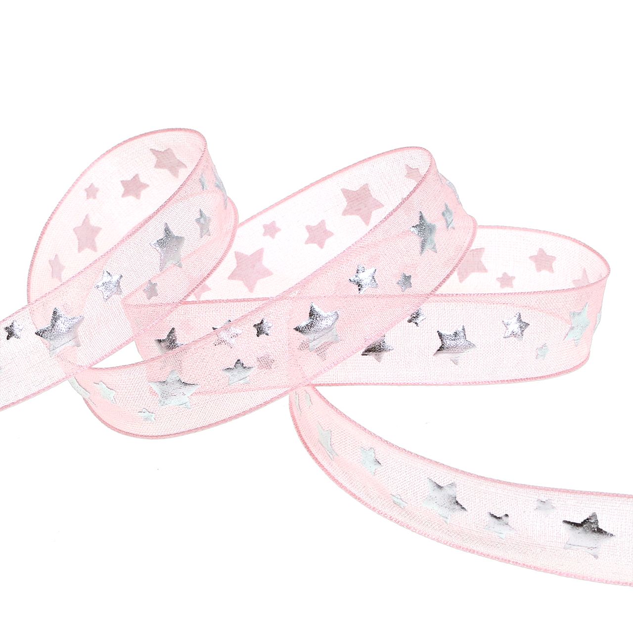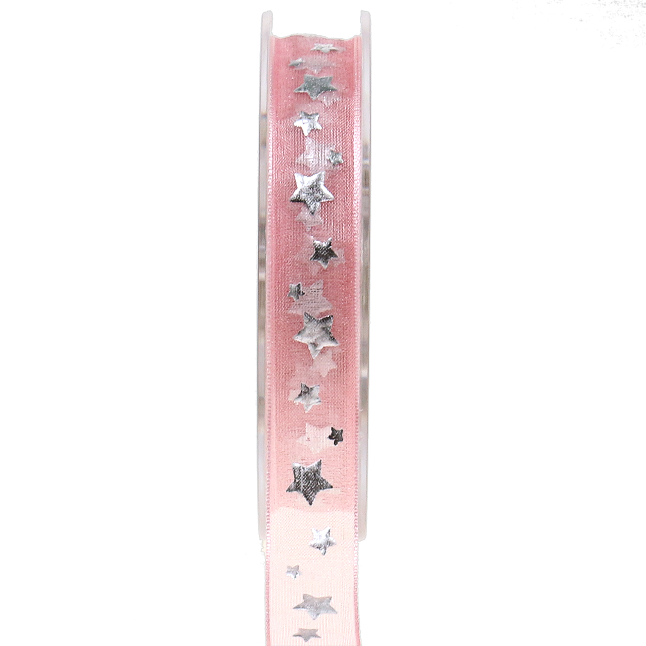 Julebånd organza rosa med stjernemotiv 15mm 20m
