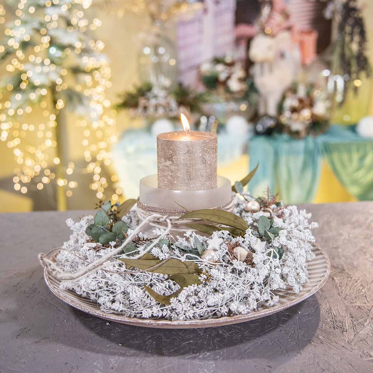 Grunnlaget er strået romersk med en diameter på ca 24 centimeter. Linurtestilkene er festet til hverandre og til strået Roman ved hjelp av tynn sølvfarget tråd og hvit hyssing. Totalt sett har den hvite julekransen laget av tørkede blomster en diameter på rundt 34 centimeter.