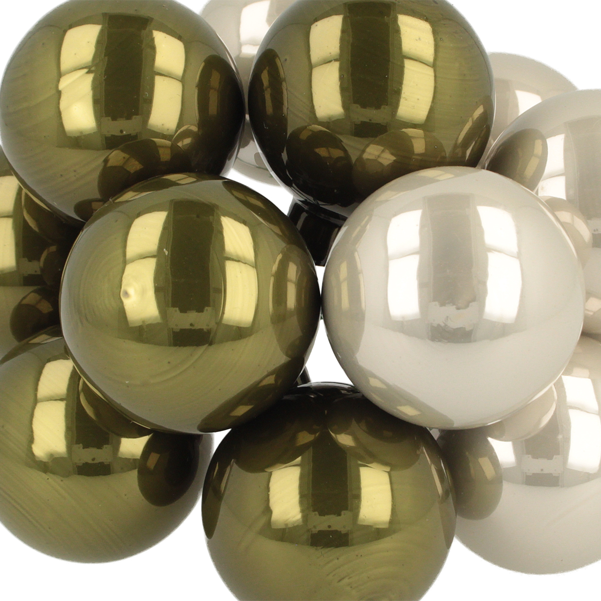 Mini-julekulene i olivengrønn og sølvgrå er tilgjengelige på ståltråd og som julekuler i andre størrelser. Du finner også mange andre speilbær i trendy farger i butikken vår.