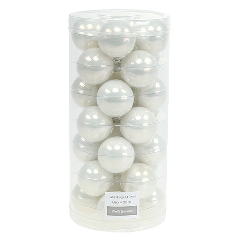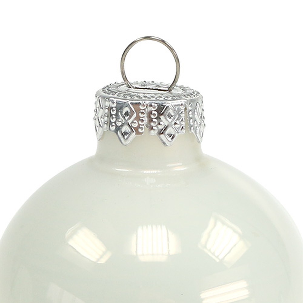 Den skinnende hvite julekulen laget av fint glass leveres i en praktisk oppbevaringsboks og i et sett på 24 stk. Hver dekorative ball har en diameter på rundt 4 centimeter og er rundt 5,5 centimeter høy, inkludert metallhatten.