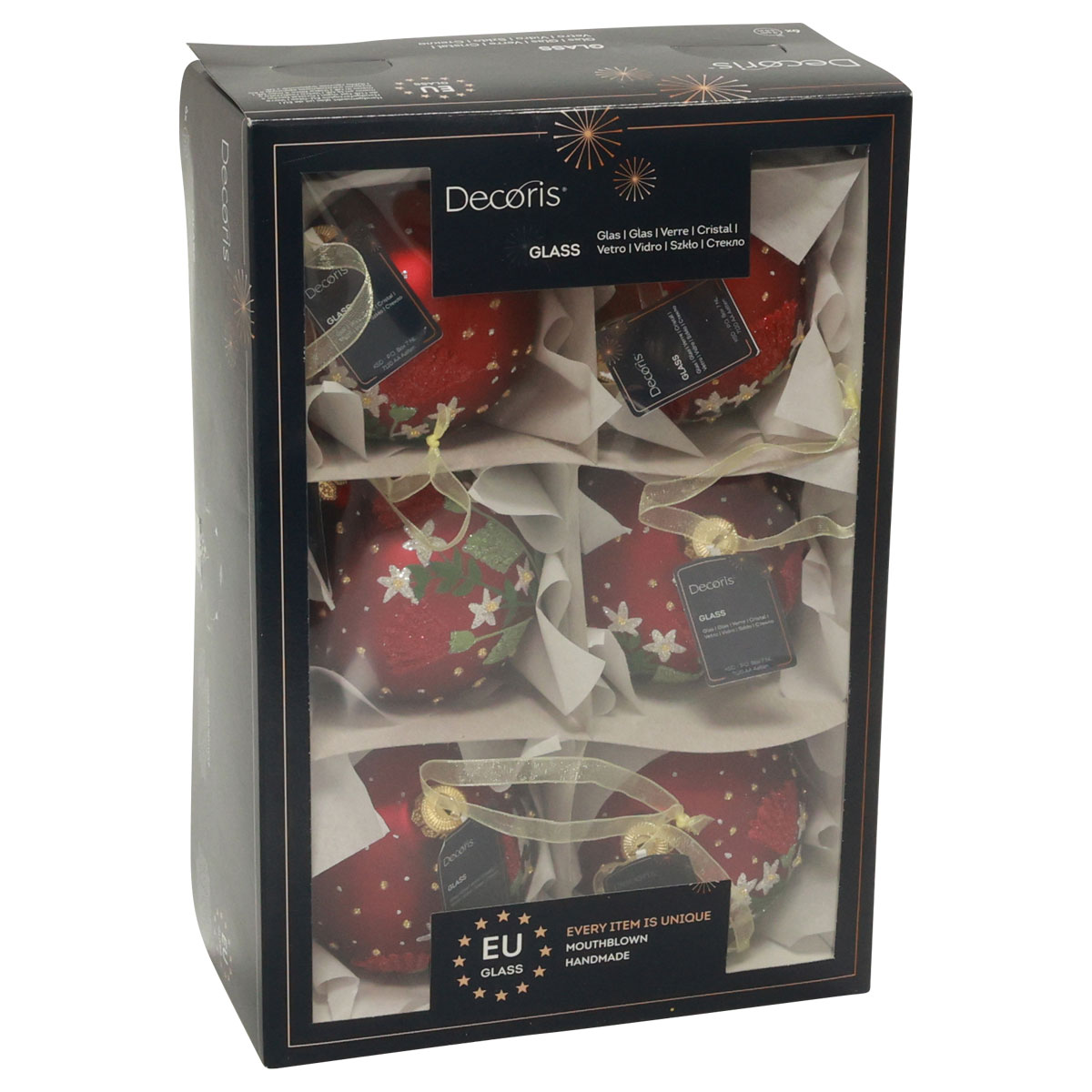 Du vil motta de røde glassjulekulene i sett med 6 stk med en diameter på ca 8 centimeter. De 6 røde glasskulene til jul har samme motiv.