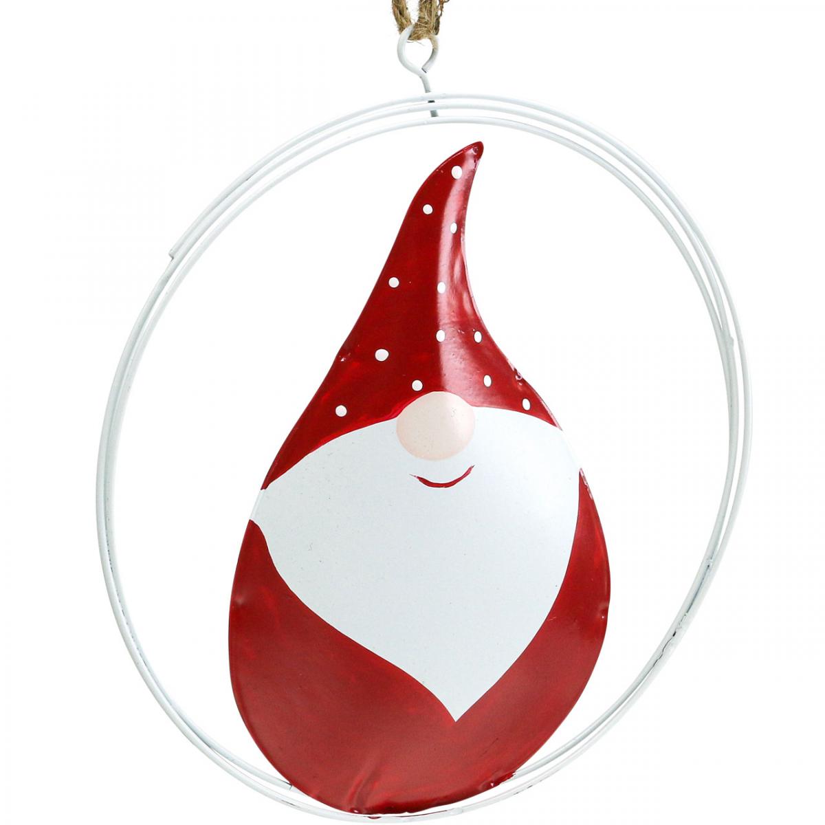 Nissen eller nissen i julehengeren har på seg en rød og hvit prikket strømpehette og et stort buskete skjegg. Med den rosa pære nesen ser metalldekorasjonen ekstremt sympatisk ut. Figuren sitter i en hvit dekorativ ring og kan henges opp umiddelbart på jutebåndet.
