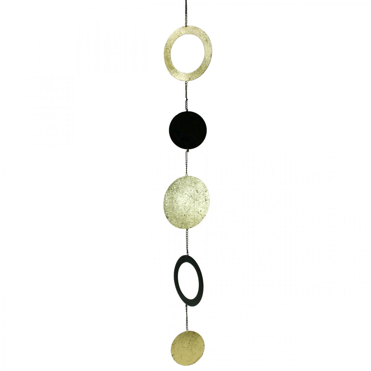 Totalt fem runde elementer i ulike størrelser og i form av sirkler eller ringer veksler med denne julepynten i sort og gull. De sirkulære formene på den hengende dekorasjonen er forbundet med hverandre med smale metallkjeder og har en liten ring øverst for oppheng.