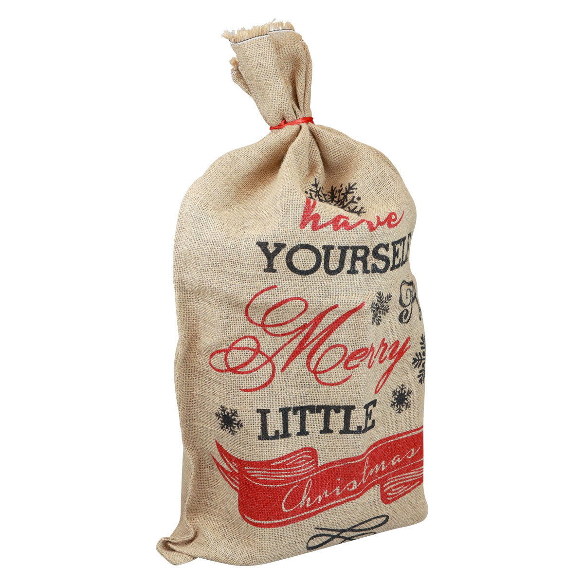 Den rustikke jutesekken til jul har et trykk av snøflak og skriften: "Ha deg en god jul" foran. – Et fint ordtak for stilig å overlevere julegaver på julaften fra gaveposen av stoff eller å drapere gaveposen dekorativt foran juletreet hjemme.