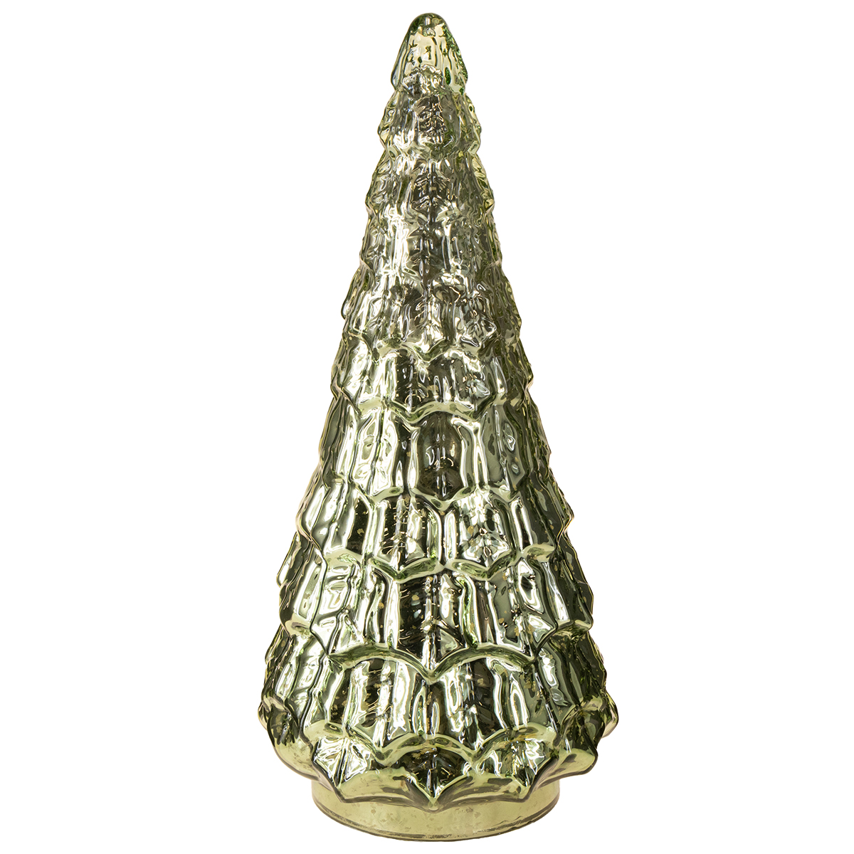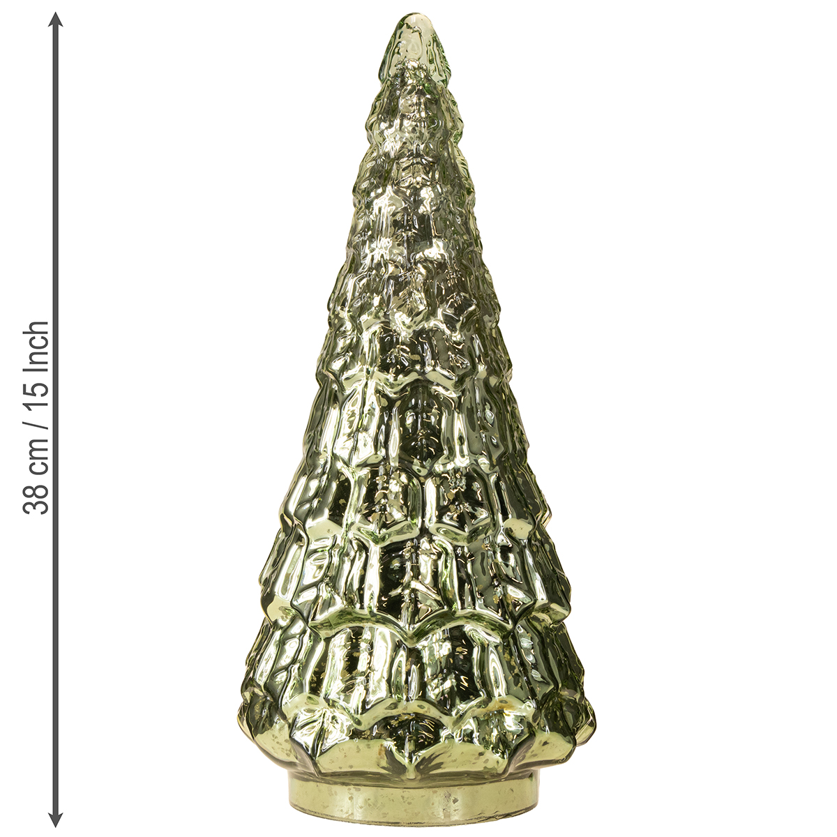 Det grønne juletreet med LED-lys imponerer ikke bare med sitt kompakte design, men også med sin sofistikerte kombinasjon av skulpturell granform, materiale og lysspill. Treet er laget av glass og, takket være sine selektive vintage-fargegraderinger, avslører det gyldne lysaksenter som, kombinert med det sølvgrønne skimret i grunnfargen, skaper en fantastisk visuell effekt. Videre står det på en solid plastbase med batterirom, slik at det kan plasseres hvor som helst. Det batteridrevne LED-lyset gir en jevn, varm glød som bringer atmosfærisk lys og hygge selv på de mørkeste vinterdagene. Perfekt for bruk i forskjellige interiørstiler, som shabby chic, landlig eller klassisk vintage-utseende!