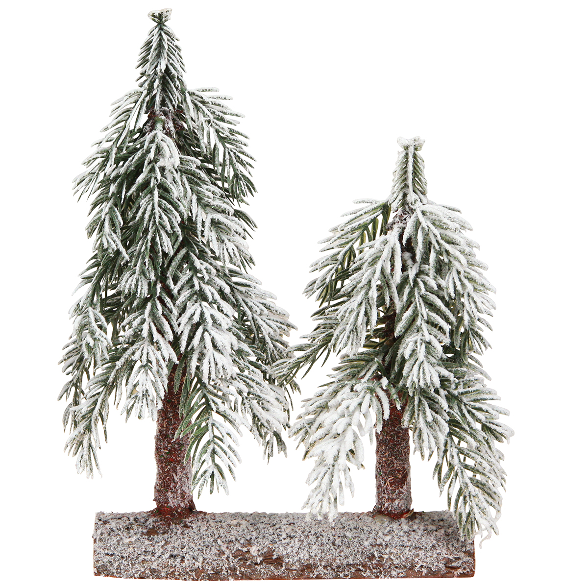 2 små snødekte juletrær på en trebunn: et must for vinterdekorasjonen