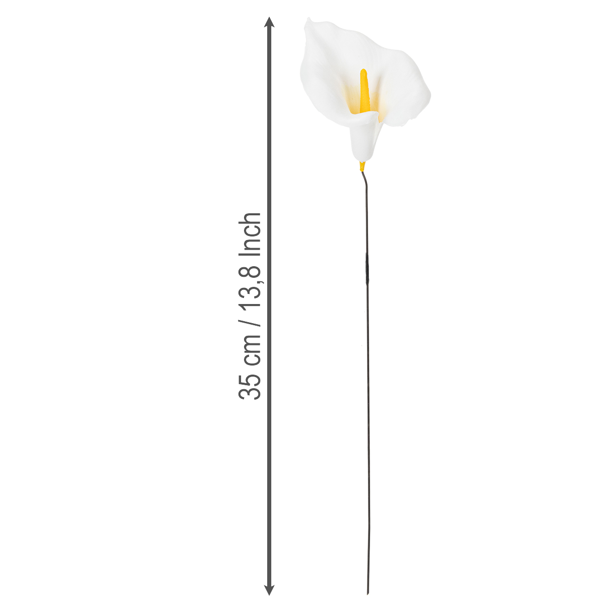 Den lille callaen på en tråd i hvitt er i en pose på 50 stykker. Den totale lengden på hver kunstig myrcala er omtrent 35 centimeter, med den brune og fleksible metalltråden omtrent 27 centimeter lang. Det hvite blomsterhodet er omtrent 10 centimeter langt og har en vakkert imitert gul pollenstang i midten, den omkringliggende trakten er også litt gul i fargen.