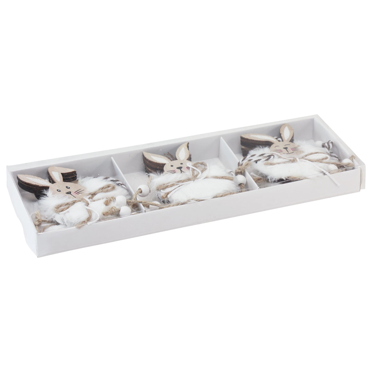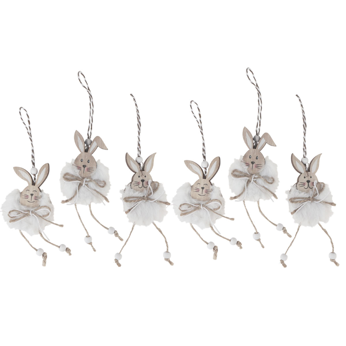 Få dine kjære til å smile med de morsomme trekaninene og heng kaninpynten med dinglende ben og dekorert med treperler i arrangementet ditt eller i påskebuketten. Noen få av de seks trekaninene vil definitivt finne en plass midt i en dørkrans.
