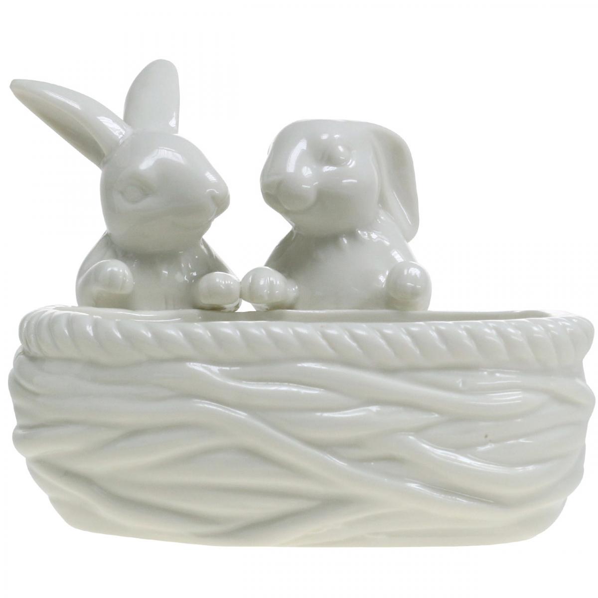 Kaniner med rede, bordpynt, påskerede, porselensdekor, dekorativ skål hvit L15cm H11cm