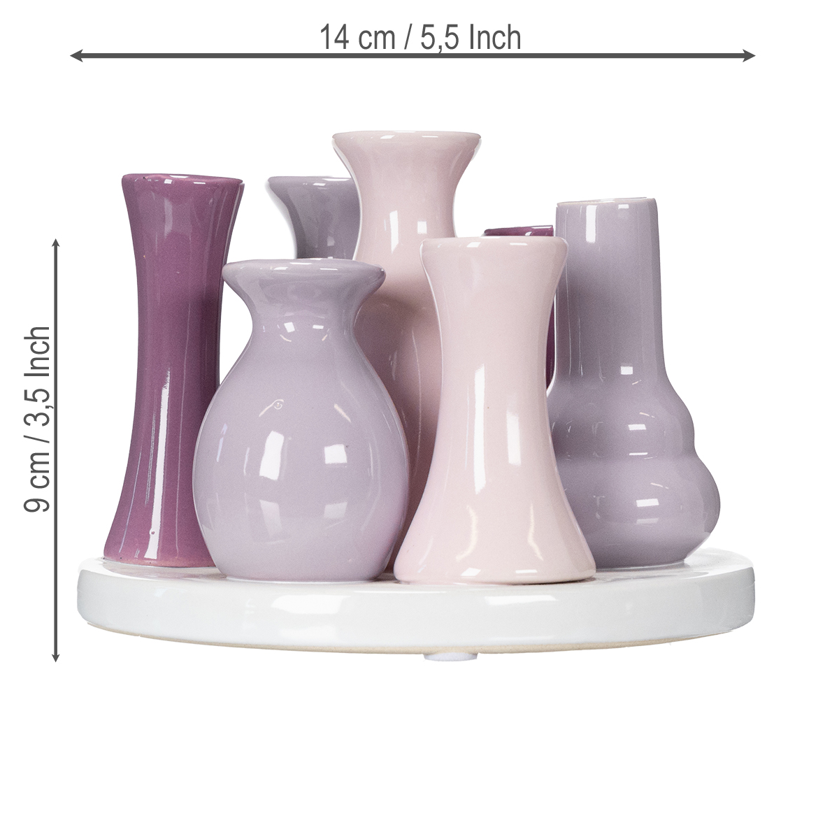 - Design: Seks integrerte vaser på en stabil keramisk tallerken
