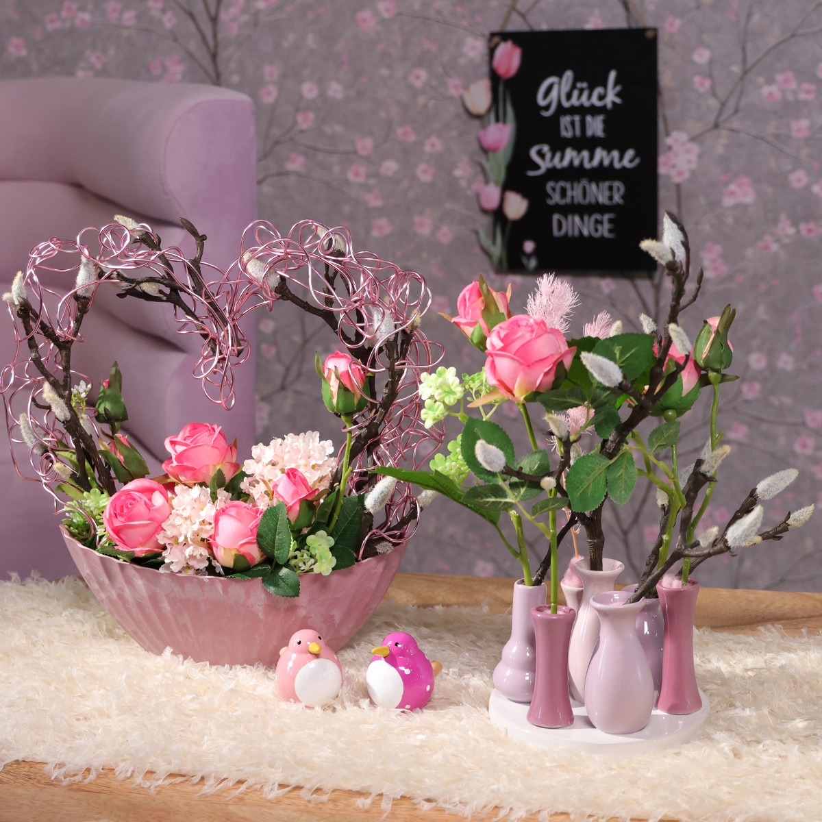 Leter du etter et spesielt preg til hjemmet ditt? Noe som tilfører friskhet, eleganse og et hint av modernitet? Dette pastellfargede vasesettet av høykvalitetskeramikk kan være akkurat det du leter etter. De seks kunstferdig formede vasene, kombinert med en solid hvit keramisk base, garanterer allsidig bruk – fra borddekorasjoner til iøynefallende hylledetaljer. Enten de er fylt med friske blomster, små buketter med tørkede blomster eller bare vist individuelt som stilige dekorasjoner, gir disse små vasene alltid det perfekte preget. Den harmoniske fargepaletten av rosa og lilla skaper en beroligende, men innbydende atmosfære. Et perfekt valg for alle som setter pris på stil og funksjonalitet og ønsker å gi boarealet sitt et moderne utseende.