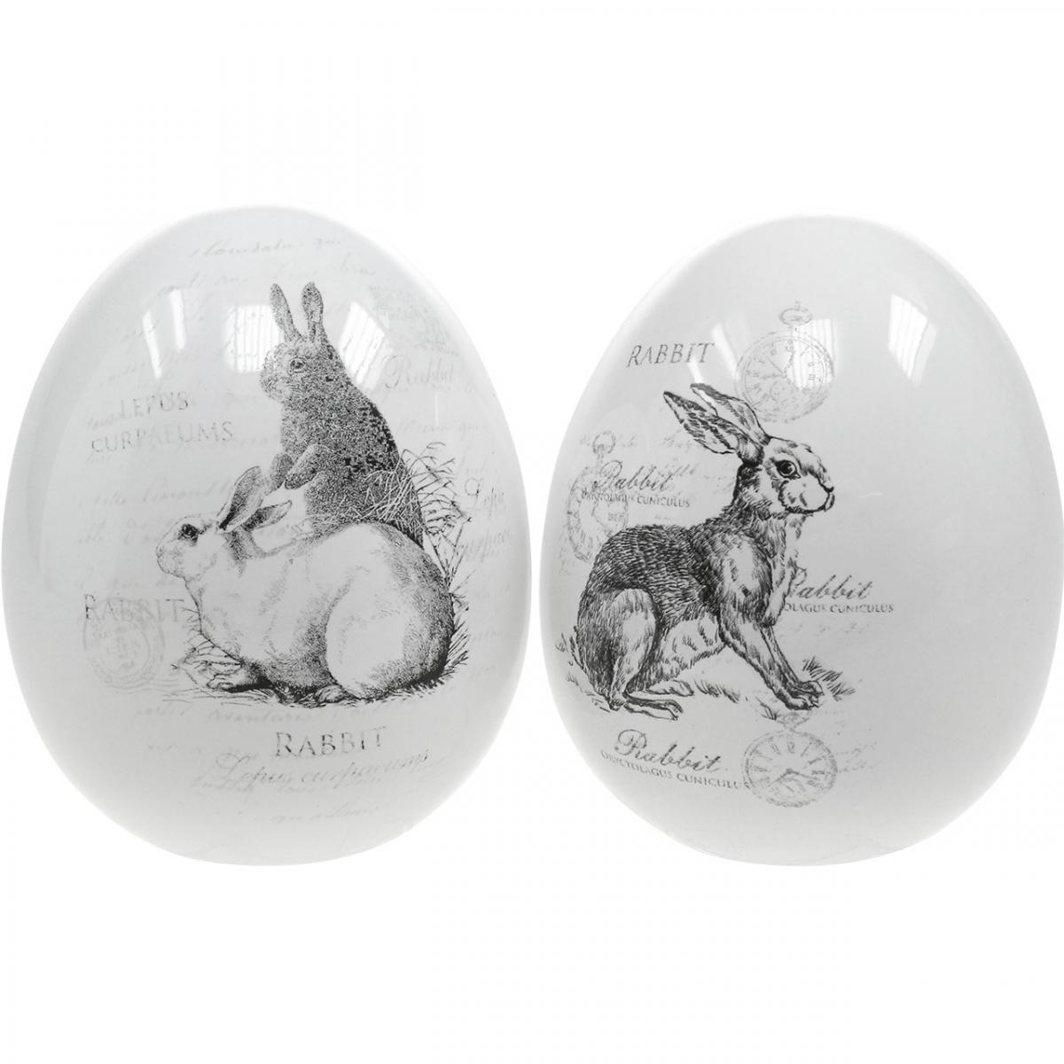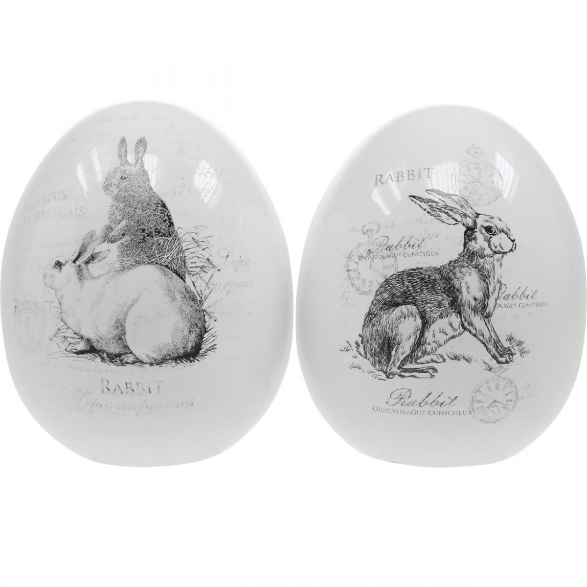 Keramisk egg, påskepynt, påskeegg med kaniner hvit, svart Ø10cm H12cm sett med 2 stk.
